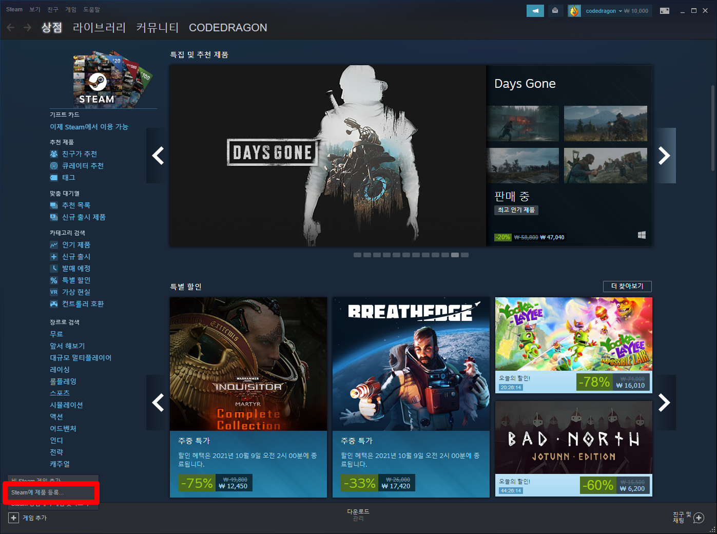 나오는 메뉴에서 [Steam에 제품 등록]을 클릭합니다.