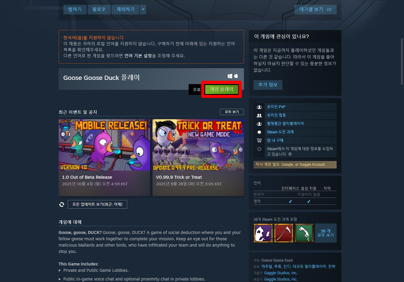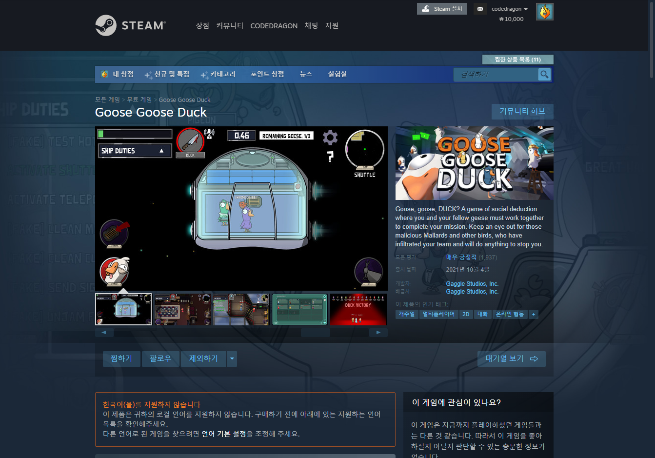 "Goose Goose Duck" 스팀 페이지 입니다.