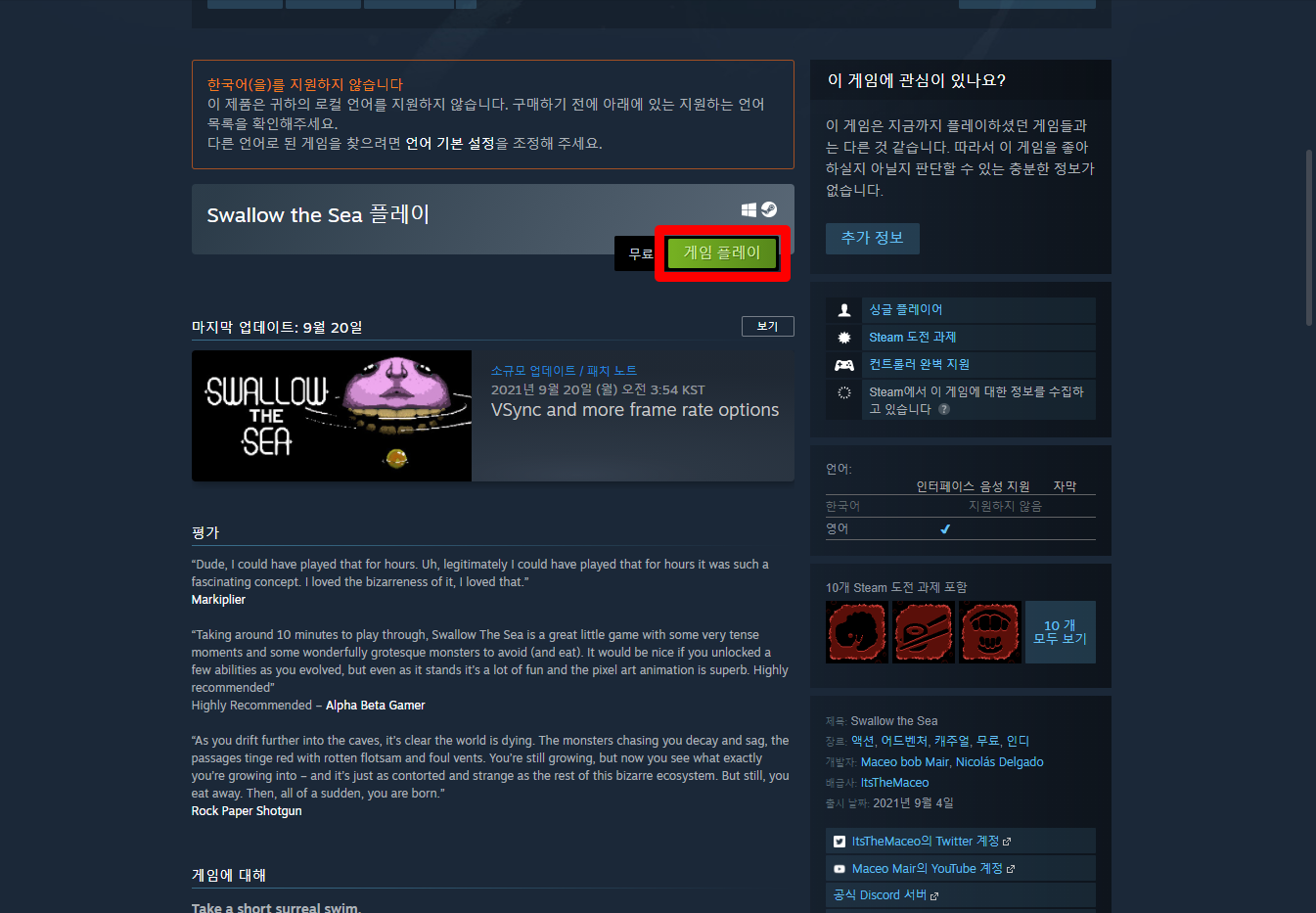 "Swallow the Sea" 스팀 페이지 입니다.