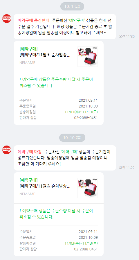 예약 구매 상황에 대해 지속적으로 알림 메시지가 발송됩니다.