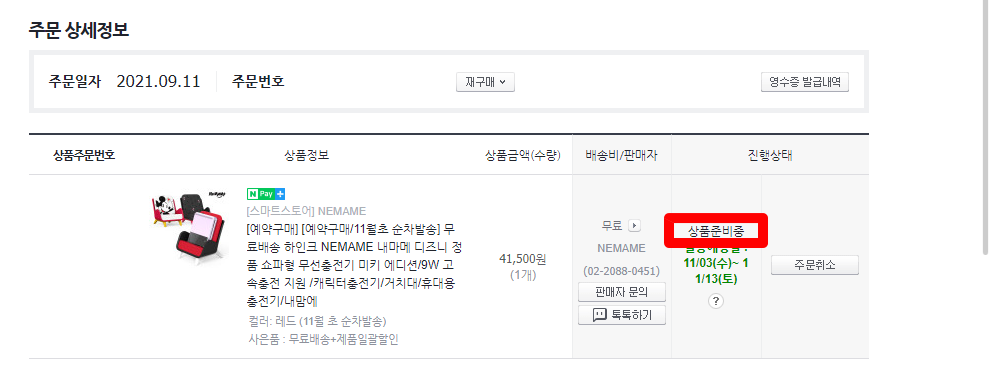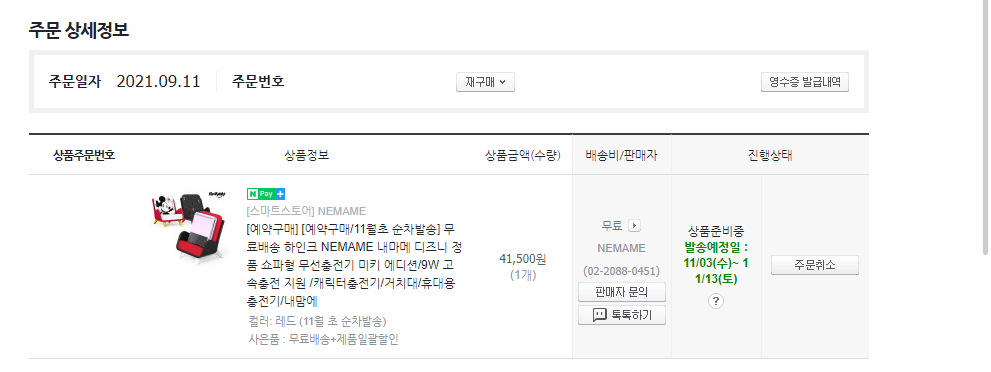 NEMAME 디즈니 정품 쇼파형 무선충전기 예약 구매 진행 상태