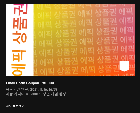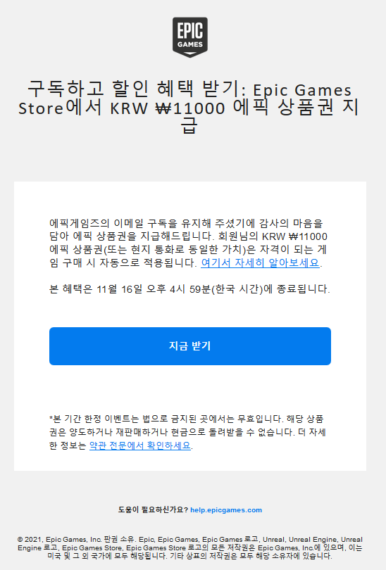 epic Games Store에서 KRW ₩11000 에픽 상품권 지급 안내 (이메일)