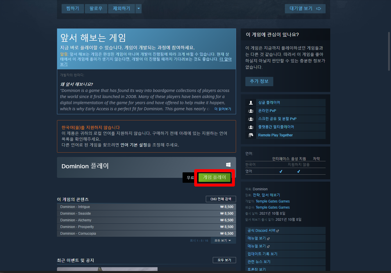"Dominion" 게임 페이지 - Steam 스팀
