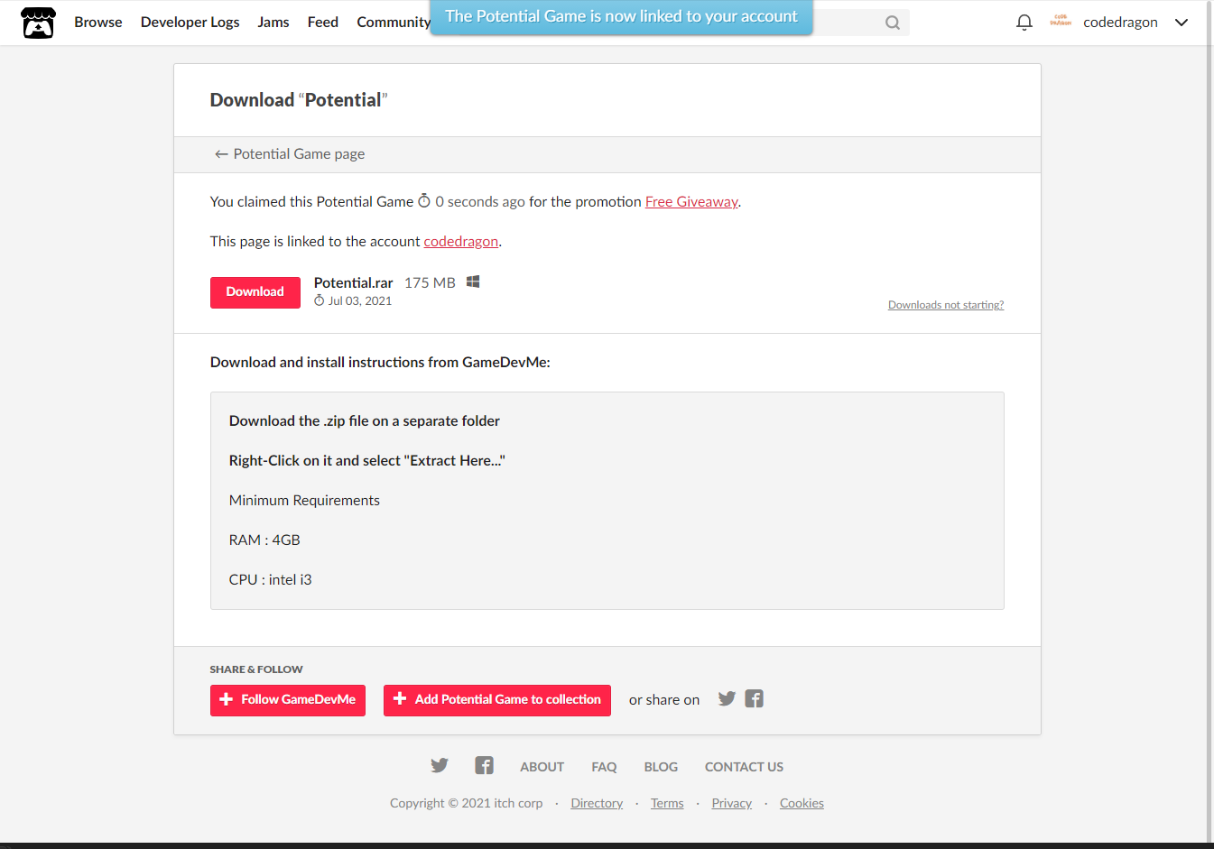 [Claim game]을 클릭하면 나의 게임 라이브러리에 추가되고 설치파일을 다운받을 수 있는 페이지로 이동됩니다.