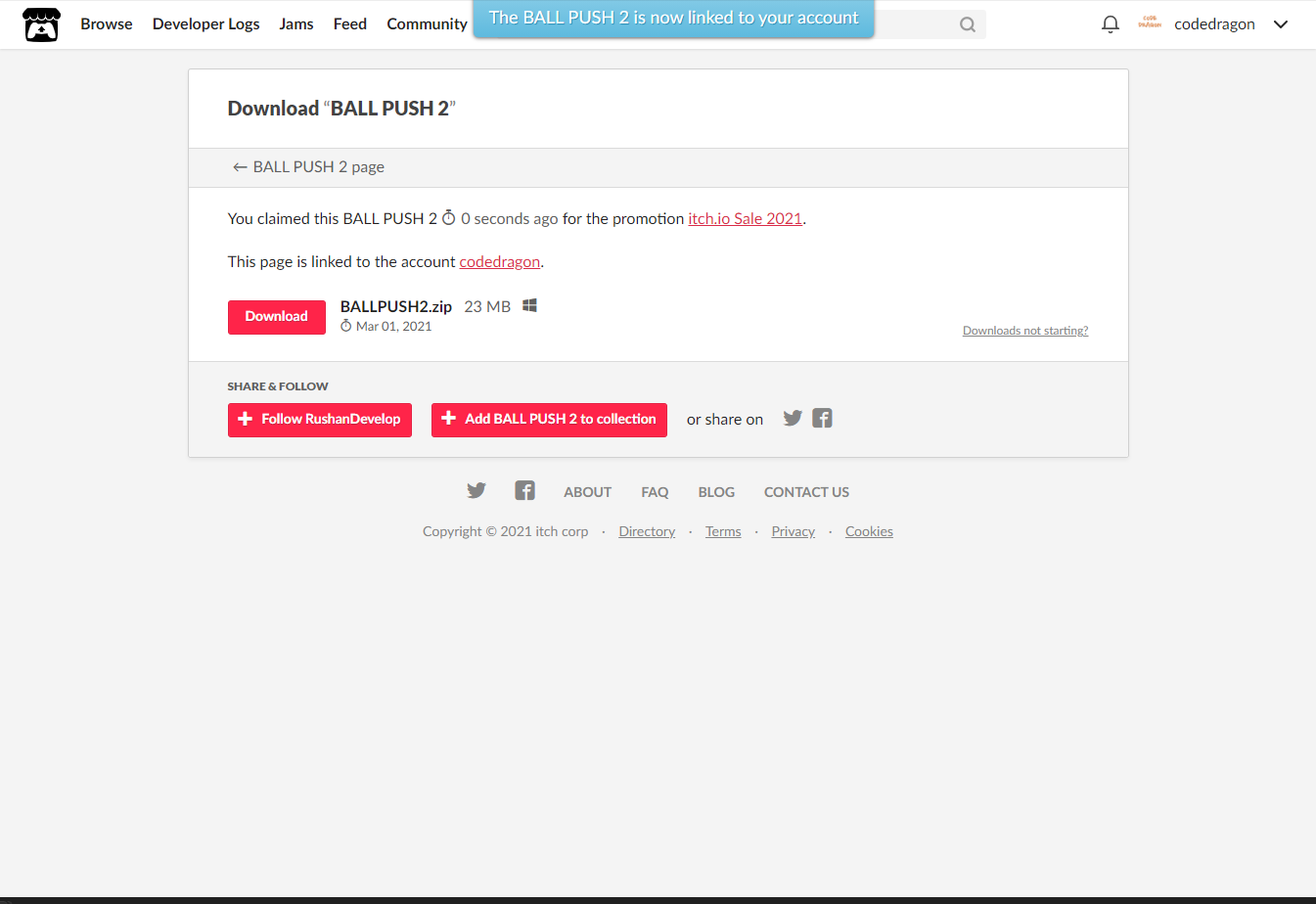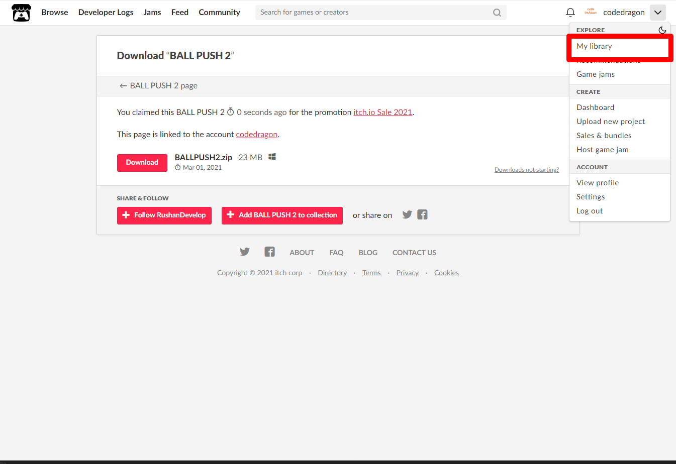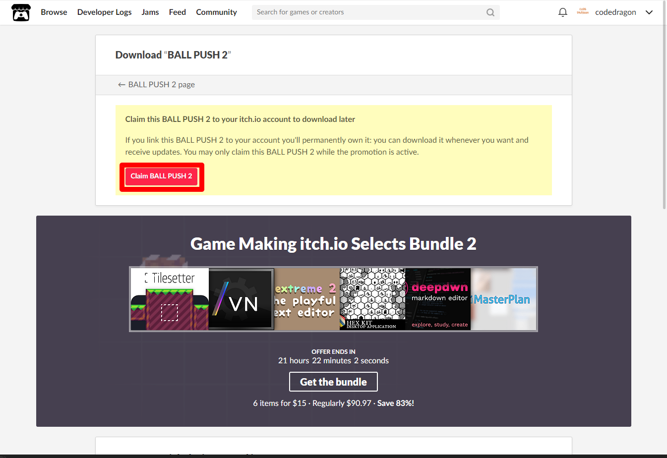 [Claim BALL PUSH 2]을 클릭하면 나의 게임 라이브러리에 추가되고