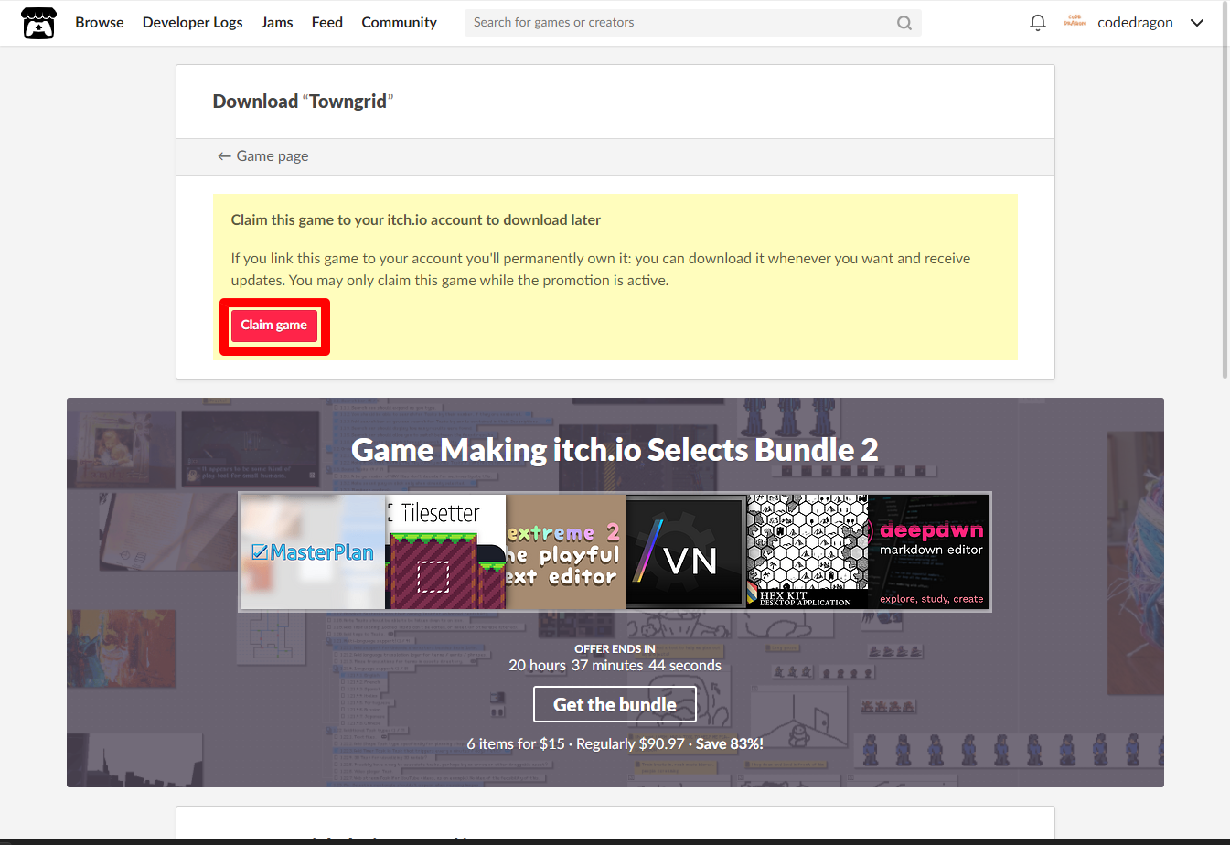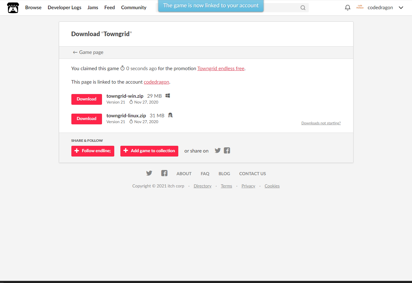 [Claim game]을 클릭하면 나의 게임 라이브러리에 추가되고 설치파일을 다운받을 수 있는 페이지로 이동됩니다.