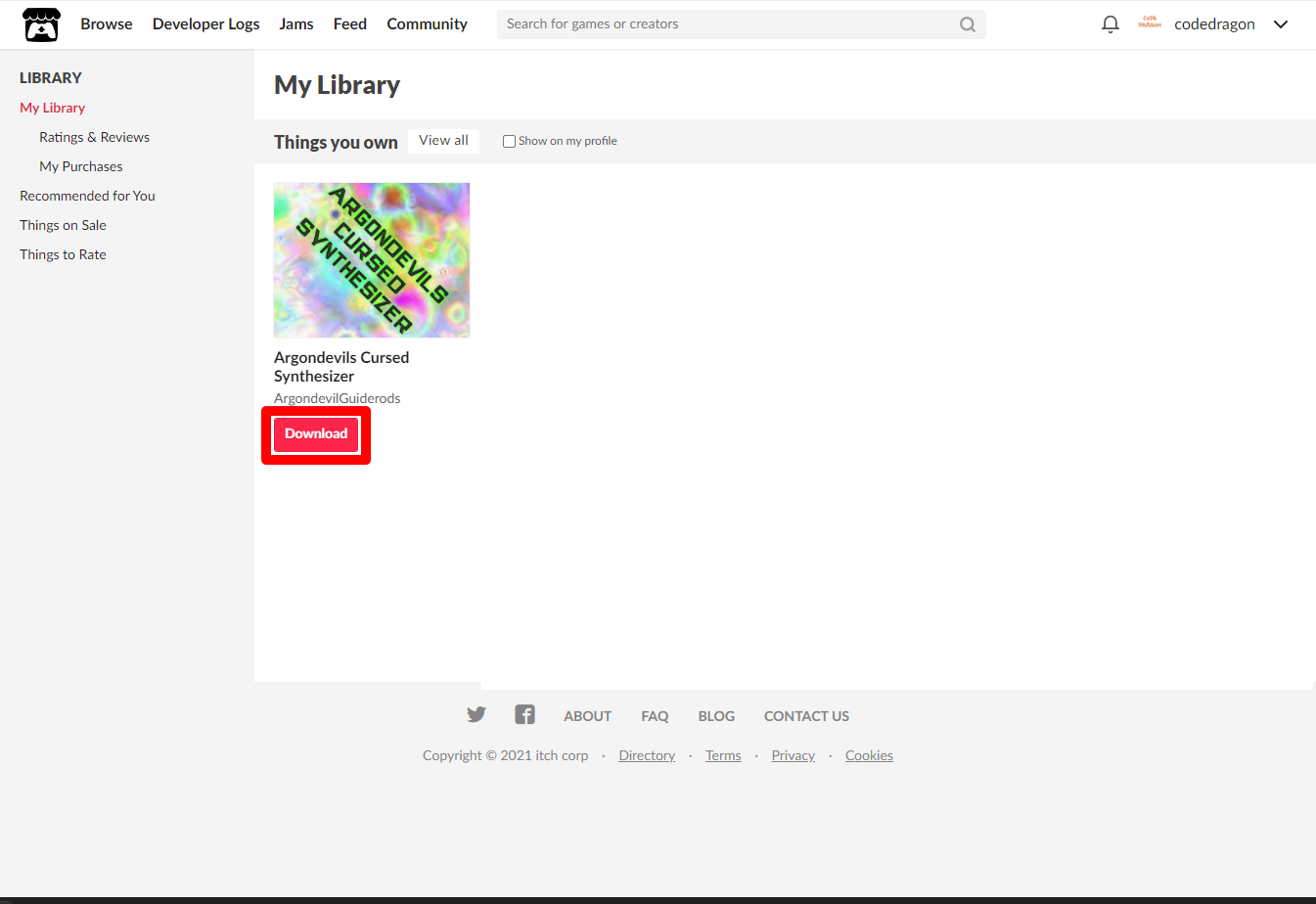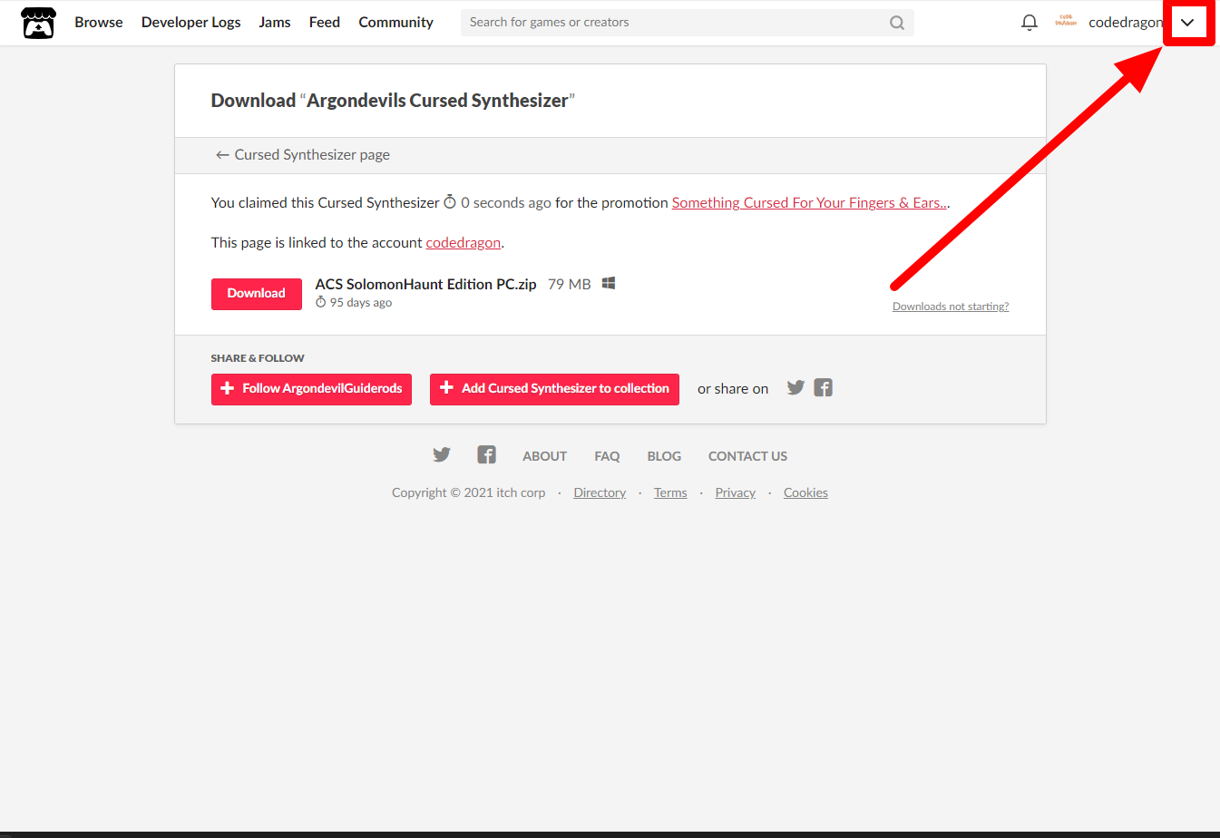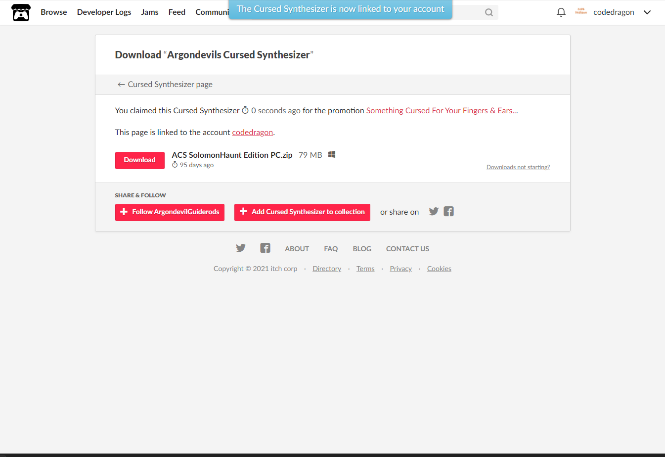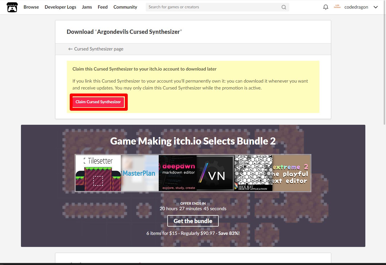 [Claim Cursed Synthesizer]을 클릭하면 나의 게임 라이브러리에 추가되고