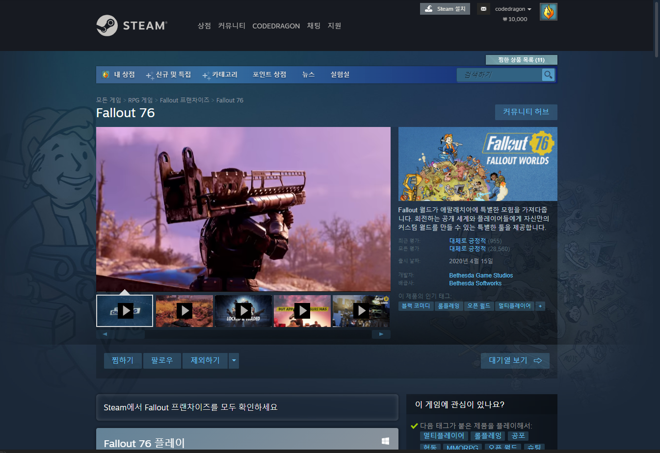 금주 게임은 "롤플레잉 RPG" 게임인 "Fallout 76" 입니다.