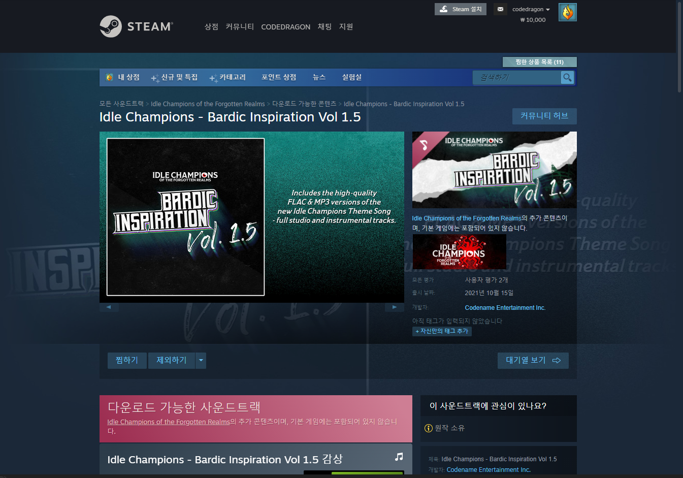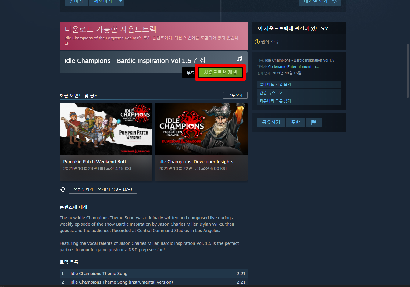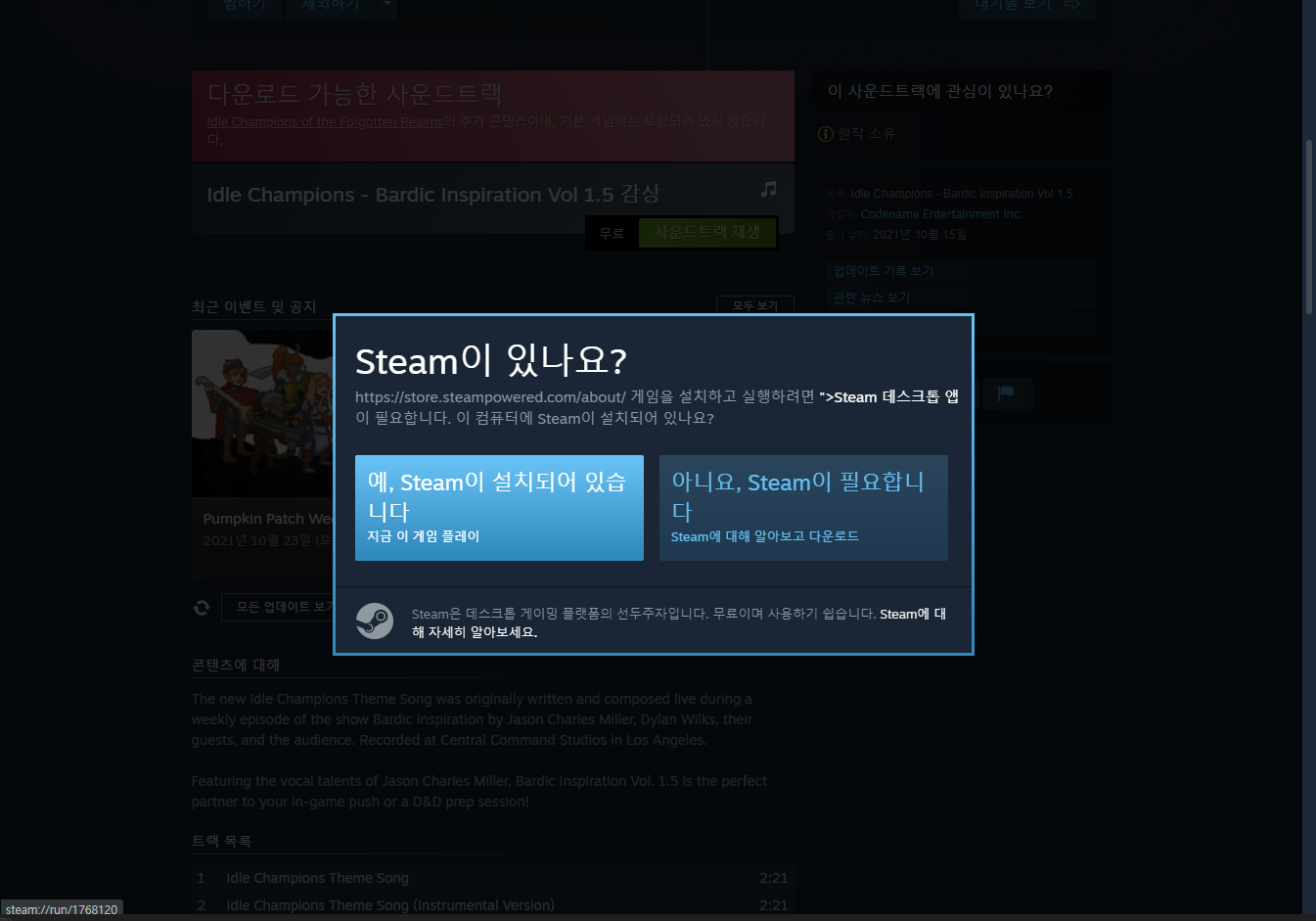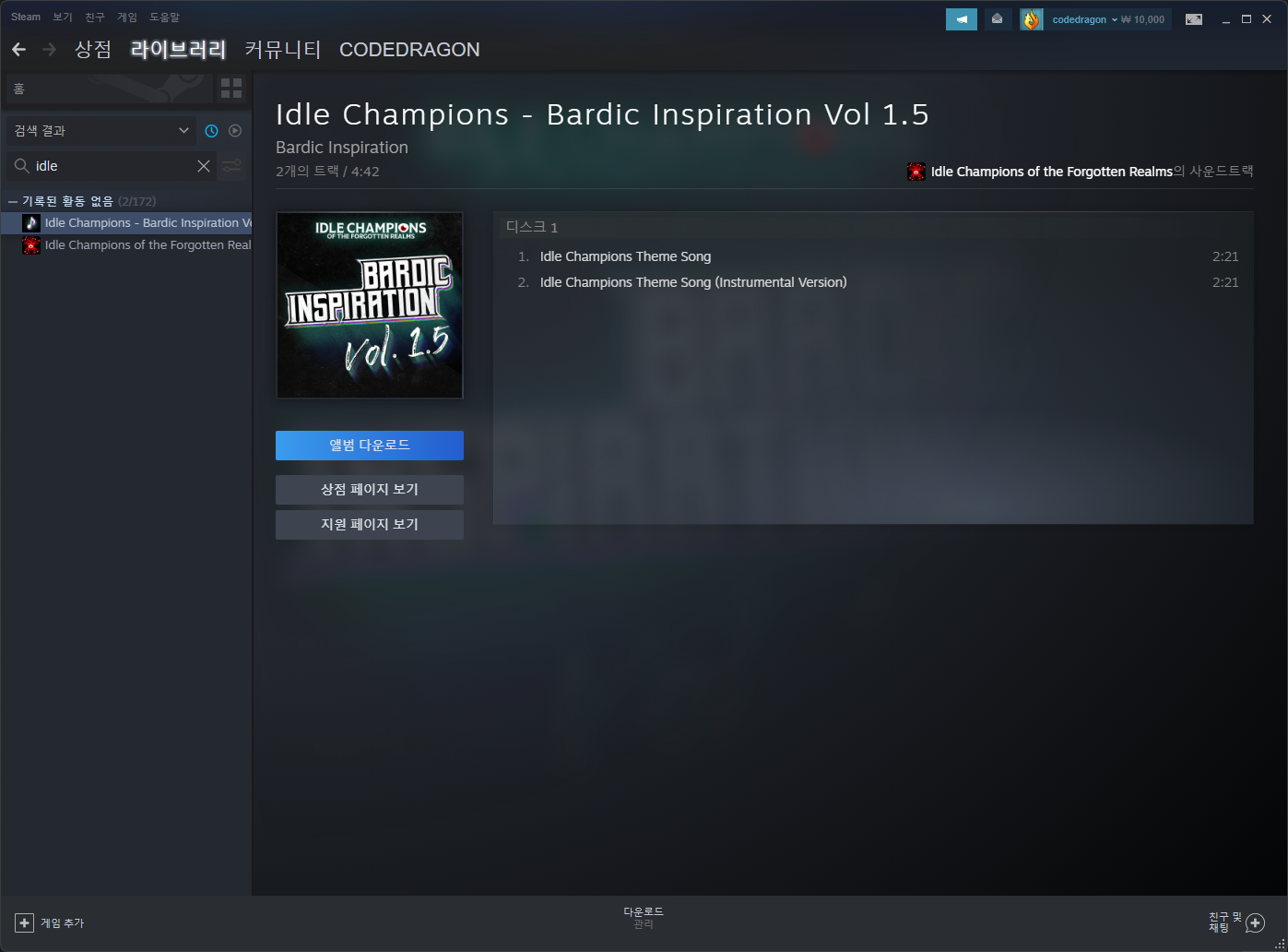 "Idle Champions of the Forgotten Realms" 과 "Idle Champions - Bardic Inspiration Vol 1.5 사운드트렉" 항목을 확인할 수 있습니다.