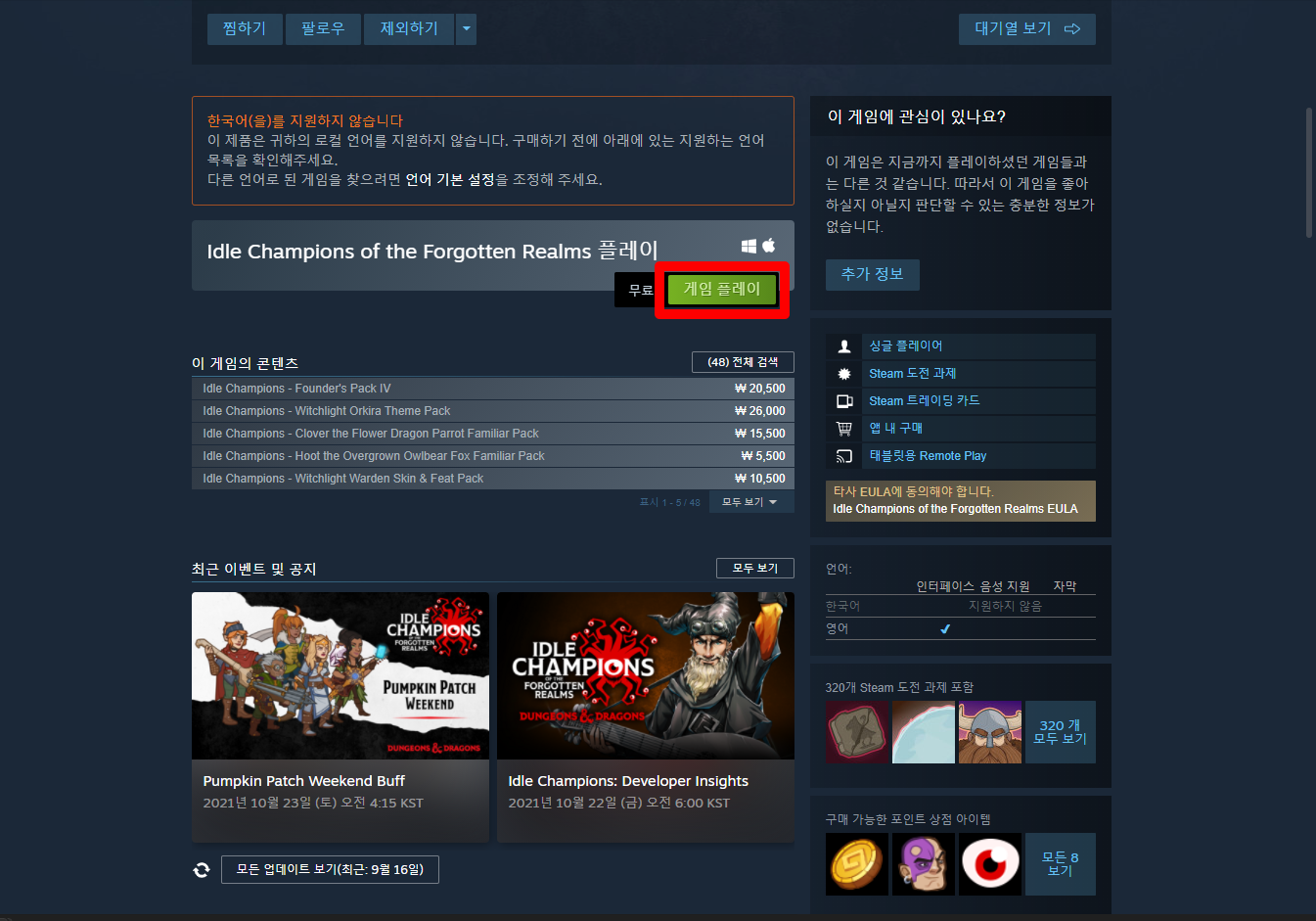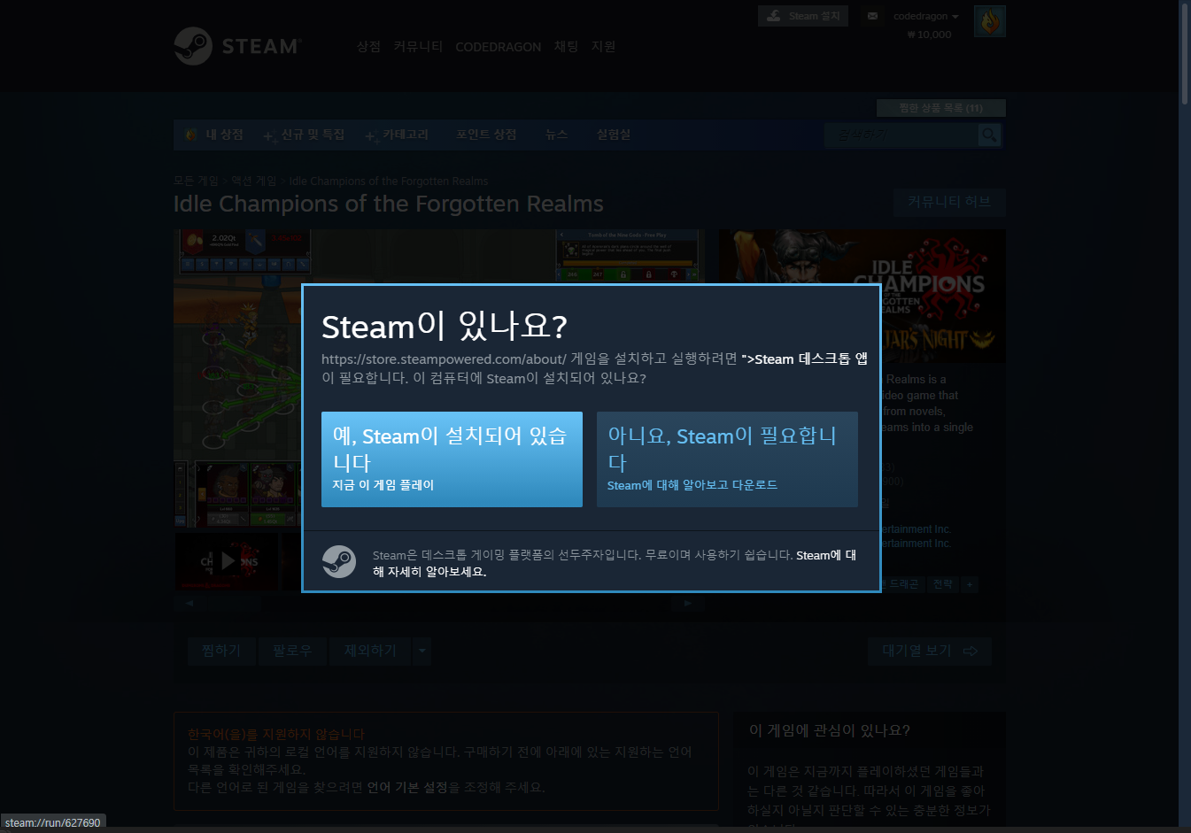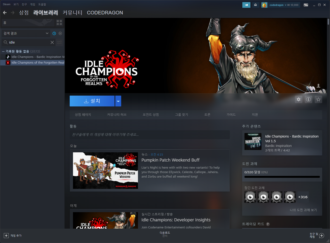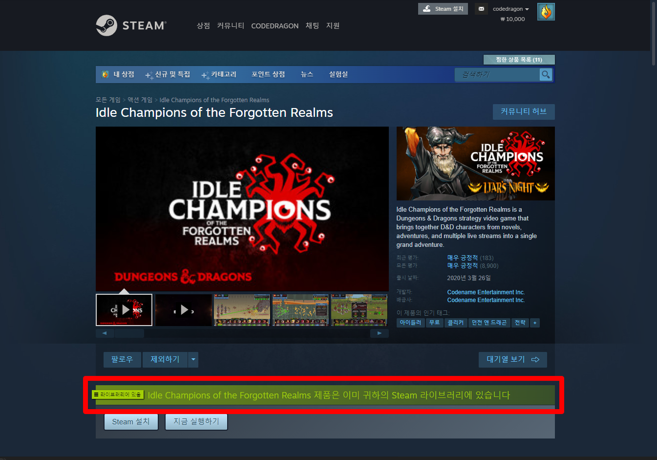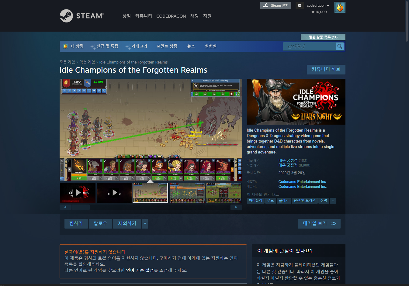 "Idle Champions of the Forgotten Realms" 스팀 페이지 입니다.