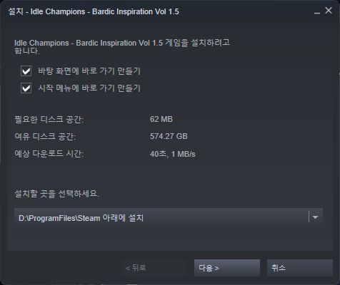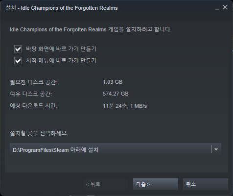 Steam 런처가 실행되면 원하는 위치에 설치를 완료해 줍니다.