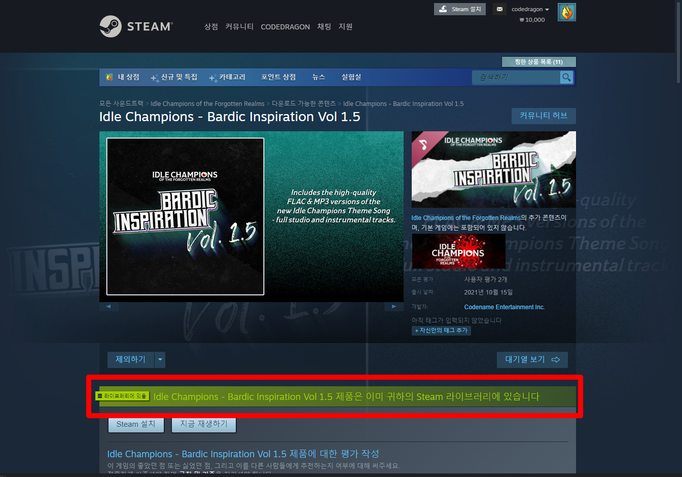 게임페이지 녹색으로 "라이브러리에 있음" 으로 표시되어 게임을 가지고 있는 것 확인할 수 있습니다.