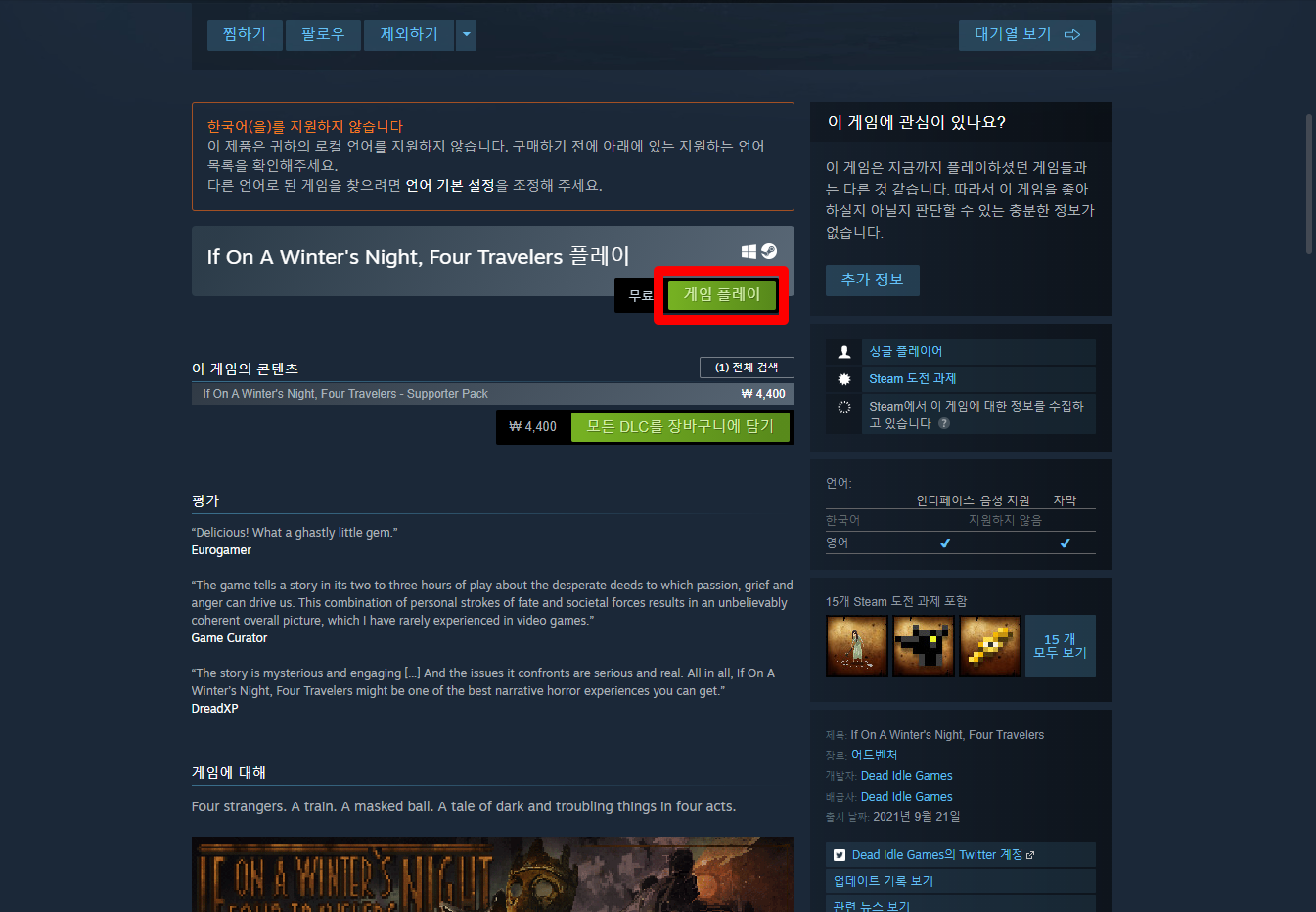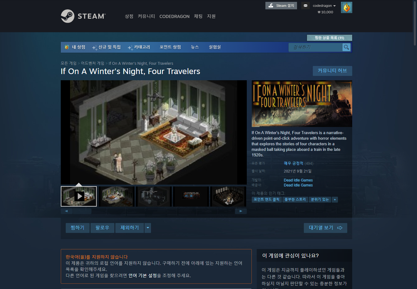 "If On A Winter's Night, Four Travelers" 스팀 페이지 입니다.