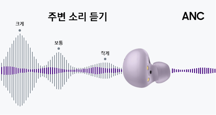 ANC(Active Noise Canceling)은 기본적으로 켜져 있으며, 갤럭시 웨어러블 앱에서 길게 누르기 동작을 설정할 수 있습니다.