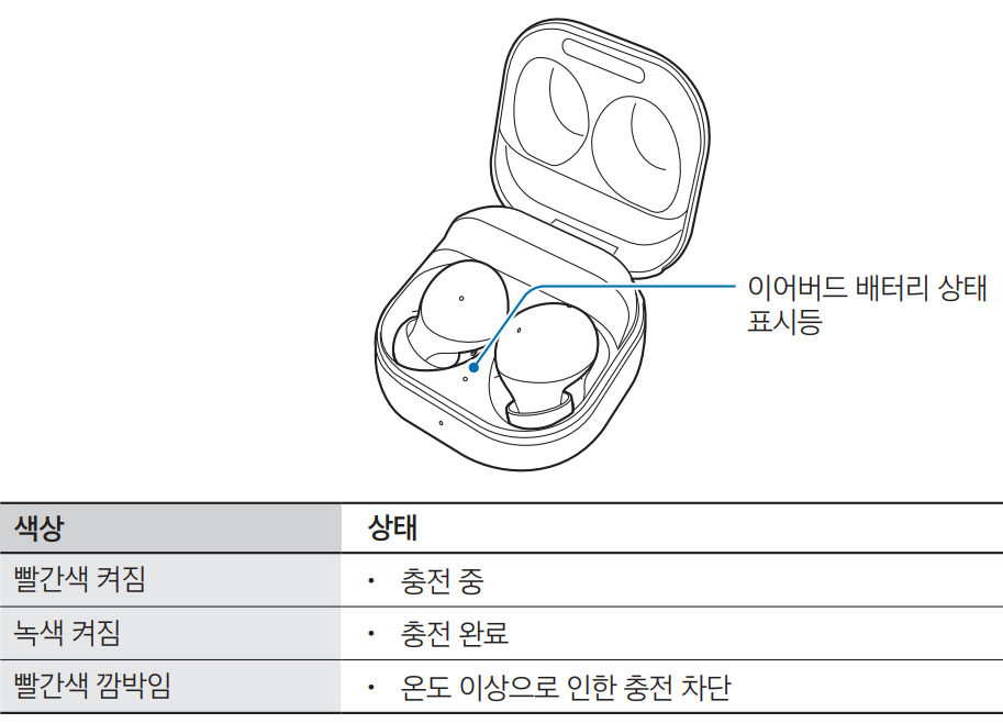 블루투스 페어링 모드에 진입한 경우 이어버드 배터리 상태 표시등이 빨간색, 녹색 순으로 깜박입니다