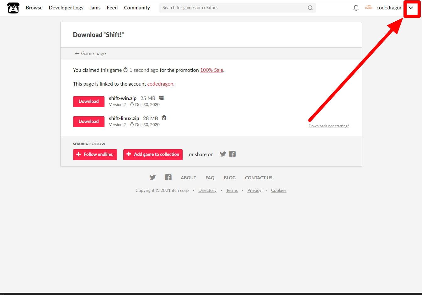 itch.io에서 받은 게임 확인해 설치파일 다운받아 보겠습니다. 우측 상단의 나의 사용자명 오른쪽의 화살표 아이콘을 클릭합니다.