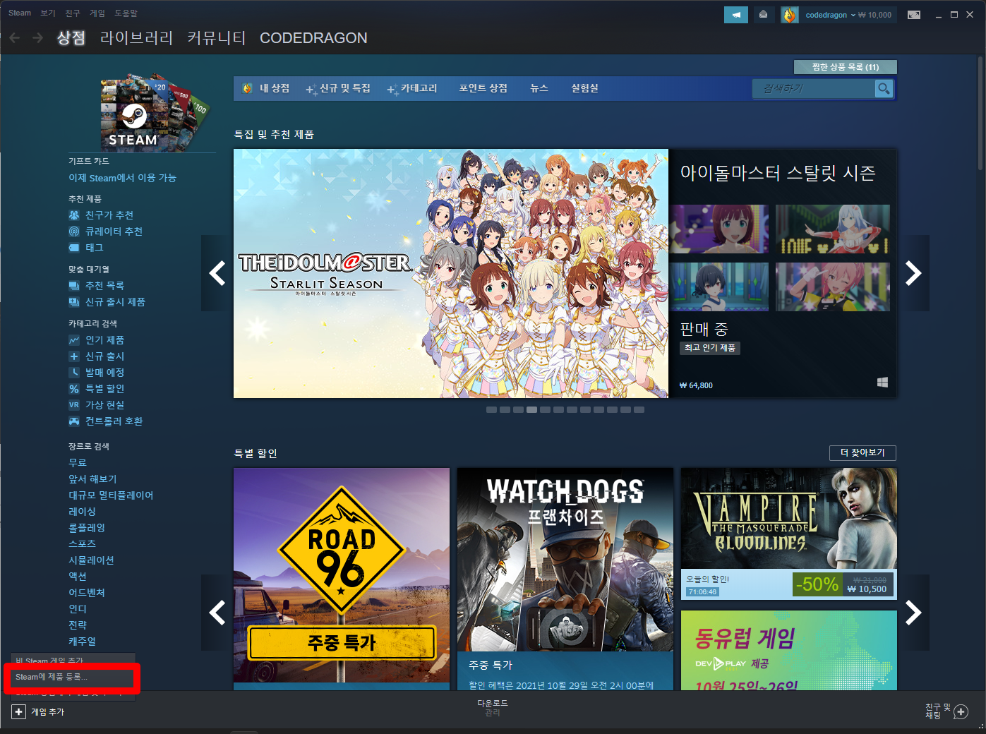 나오는 메뉴에서 [Steam에 제품 등록]을 클릭합니다.