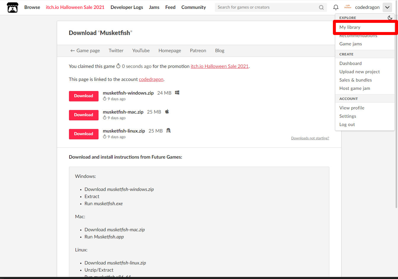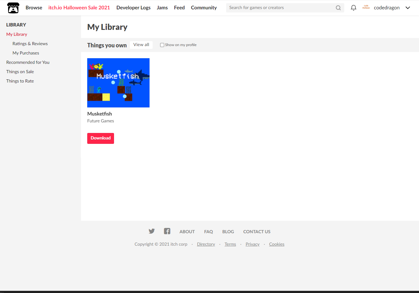 "My Lirary"에서 방금 받은 "Musketfish" 게임 항목을 확인할 수 있습니다.