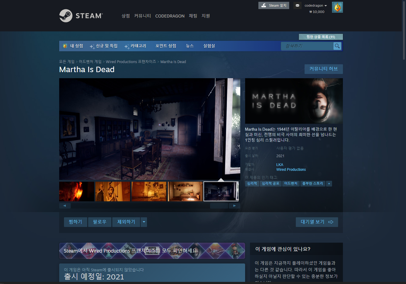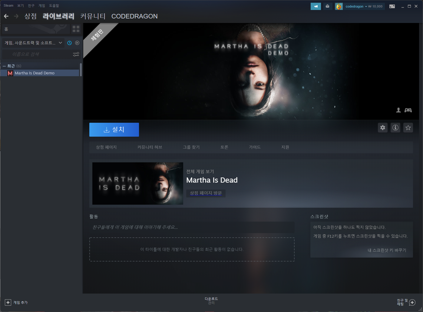 나의 게임 라이브러리에서 등록한 "Martha Is Dead" 항목을 확인할 수 있습니다