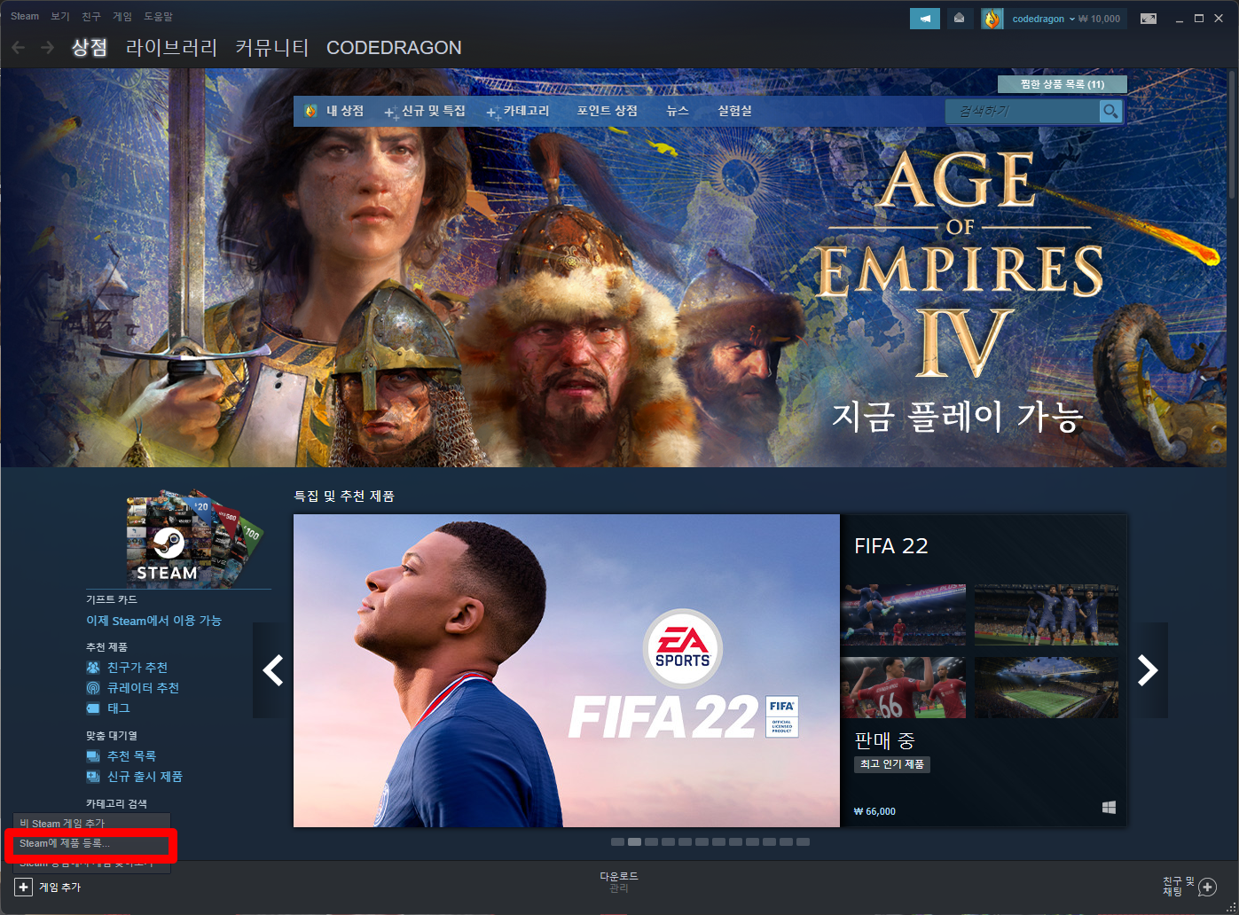나오는 메뉴에서 [Steam에 제품 등록]을 클릭합니다.