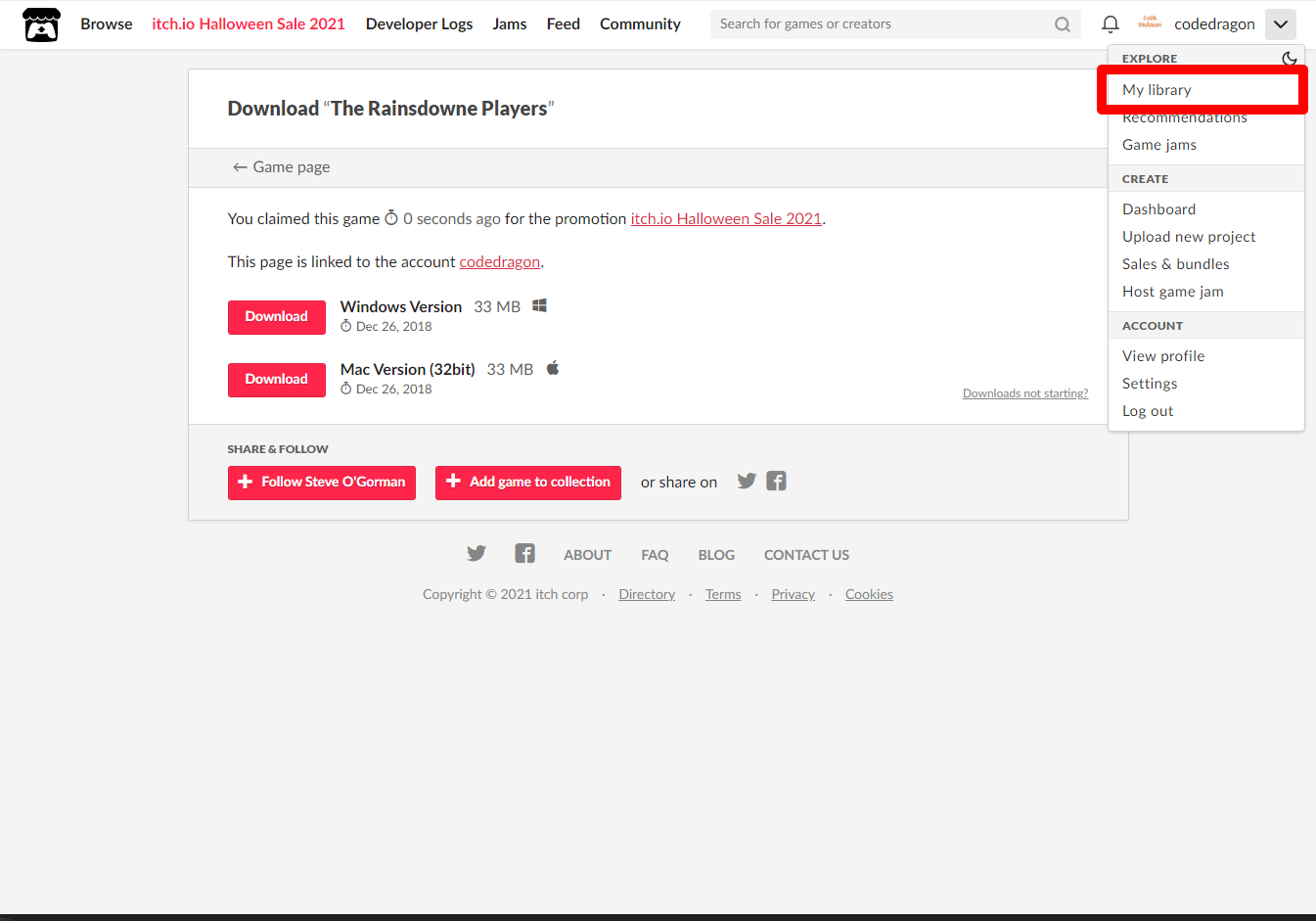 [Claim game]을 클릭하면 나의 게임 라이브러리에 추가되고 설치파일을 다운받을 수 있는 페이지로 이동됩니다.