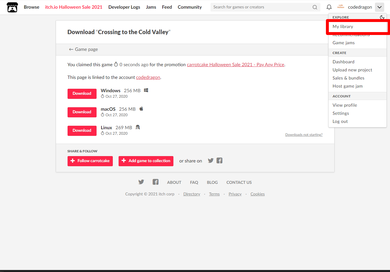 [Claim game]을 클릭하면 나의 게임 라이브러리에 추가되고 설치파일을 다운받을 수 있는 페이지로 이동됩니다.