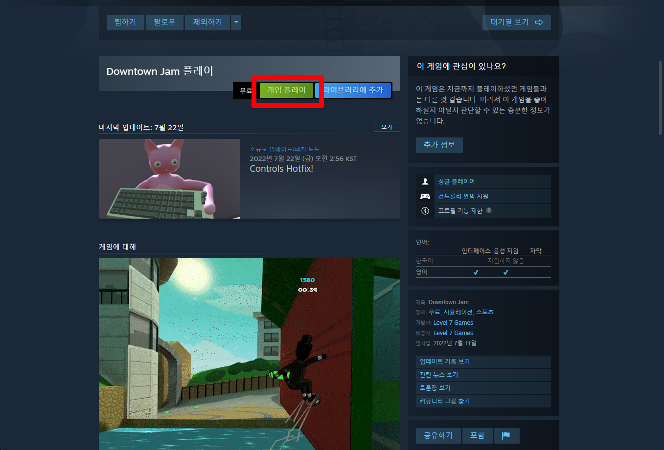 "Downtown Jam" 페이지를 내려 [게임 플레이]를 클릭하면 됩니다.