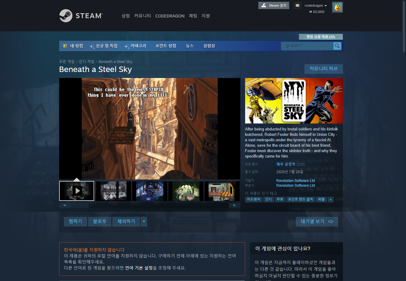 "Beneath a Steel Sky" 스팀 페이지 입니다.
