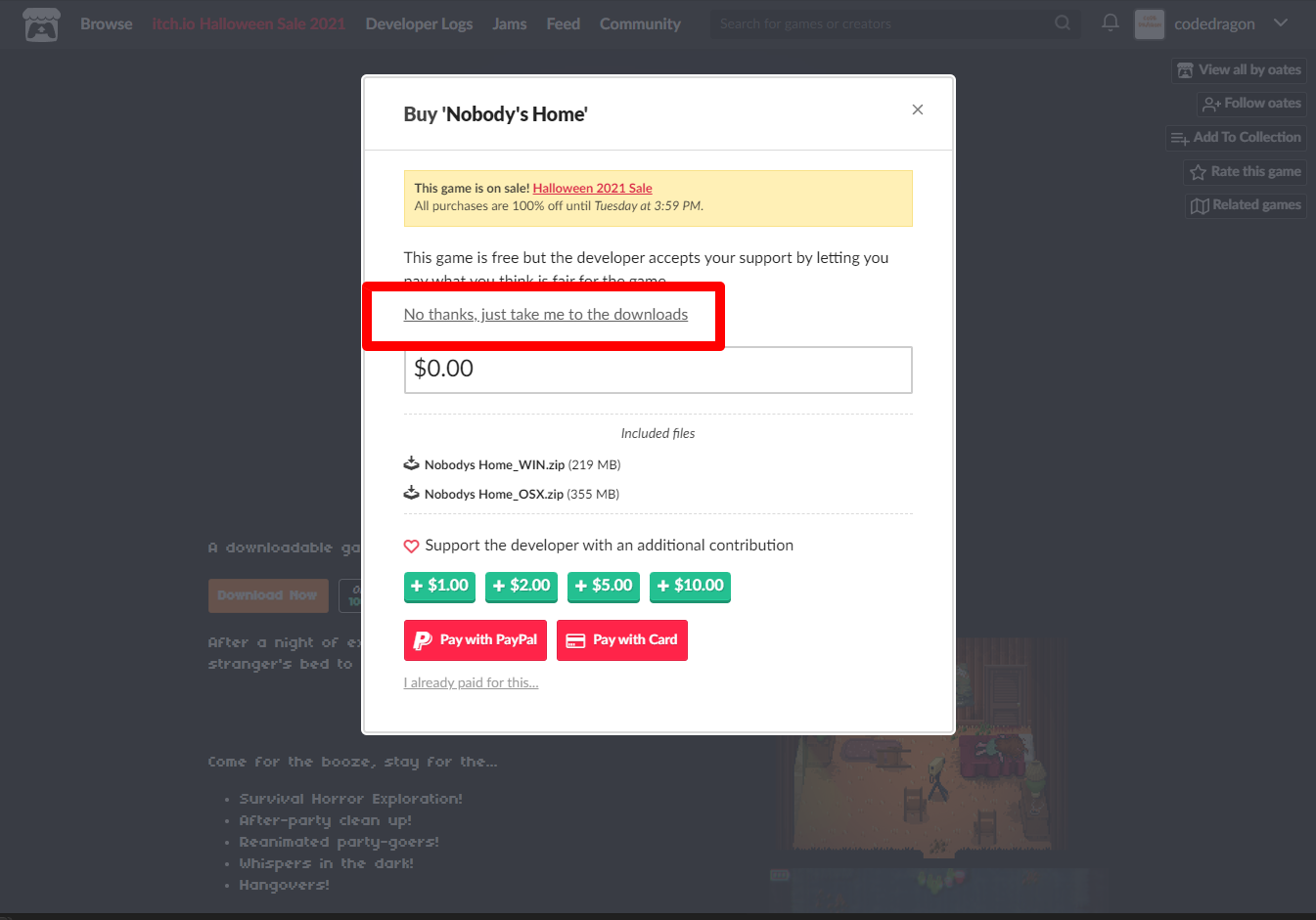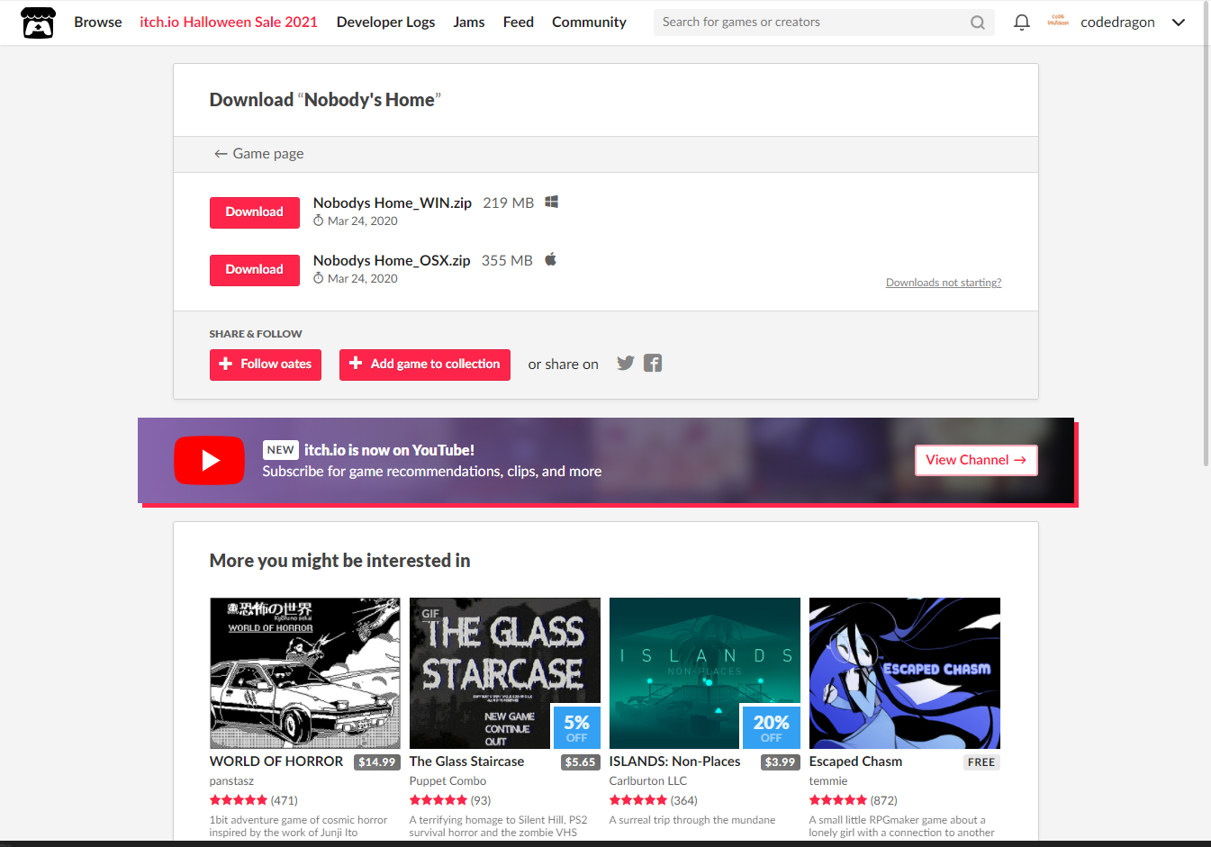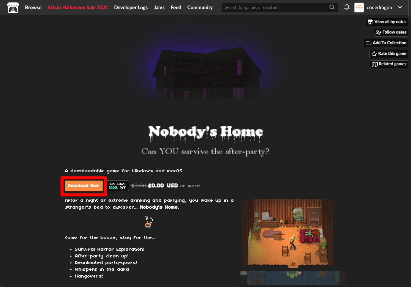 "Nobody's Home" 해당 항목에 있는 [Download] 버튼을 클릭하면 게임의 설치파일을 다운받을 수 있습니다.