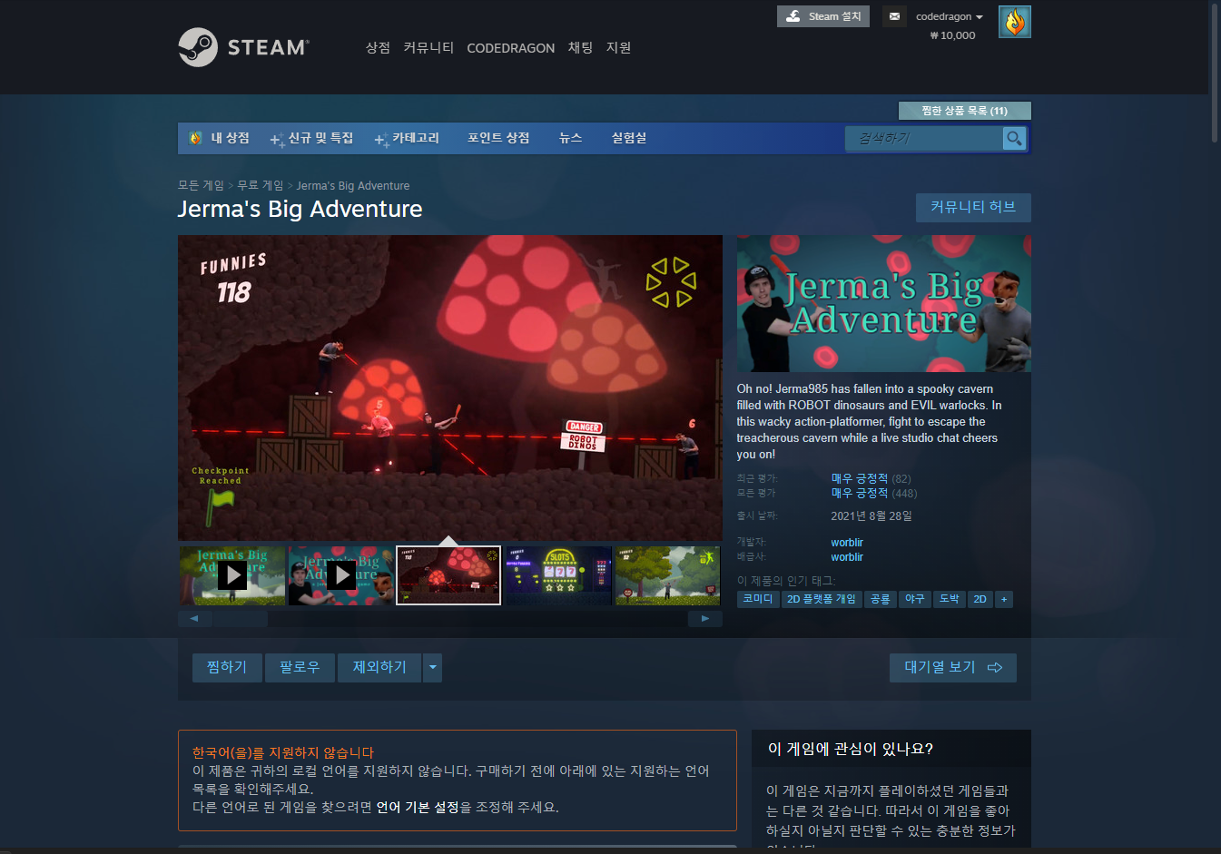 "Jerma's Big Adventure" 스팀 페이지 입니다.