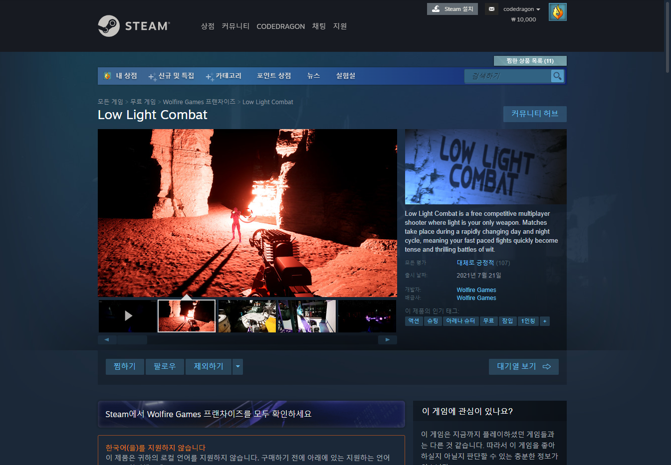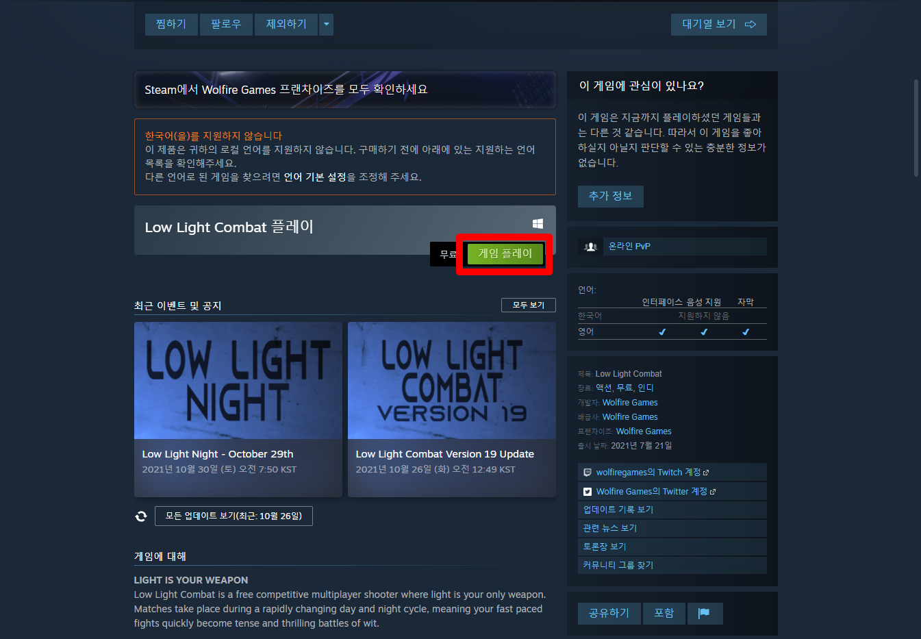 "Low Light Combat" 스팀 페이지 입니다.