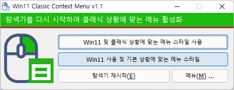 윈도우탐색기 메뉴 형식을 Windows10과 Windows11 스타일로 변경시켜주는 프로그램입니다.