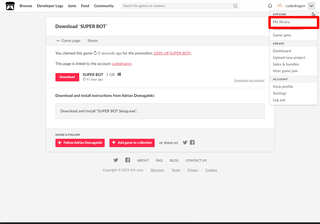 "My Lirary"에서 방금 받은 "SUPER BOT" 게임 항목을 확인할 수 있습니다.