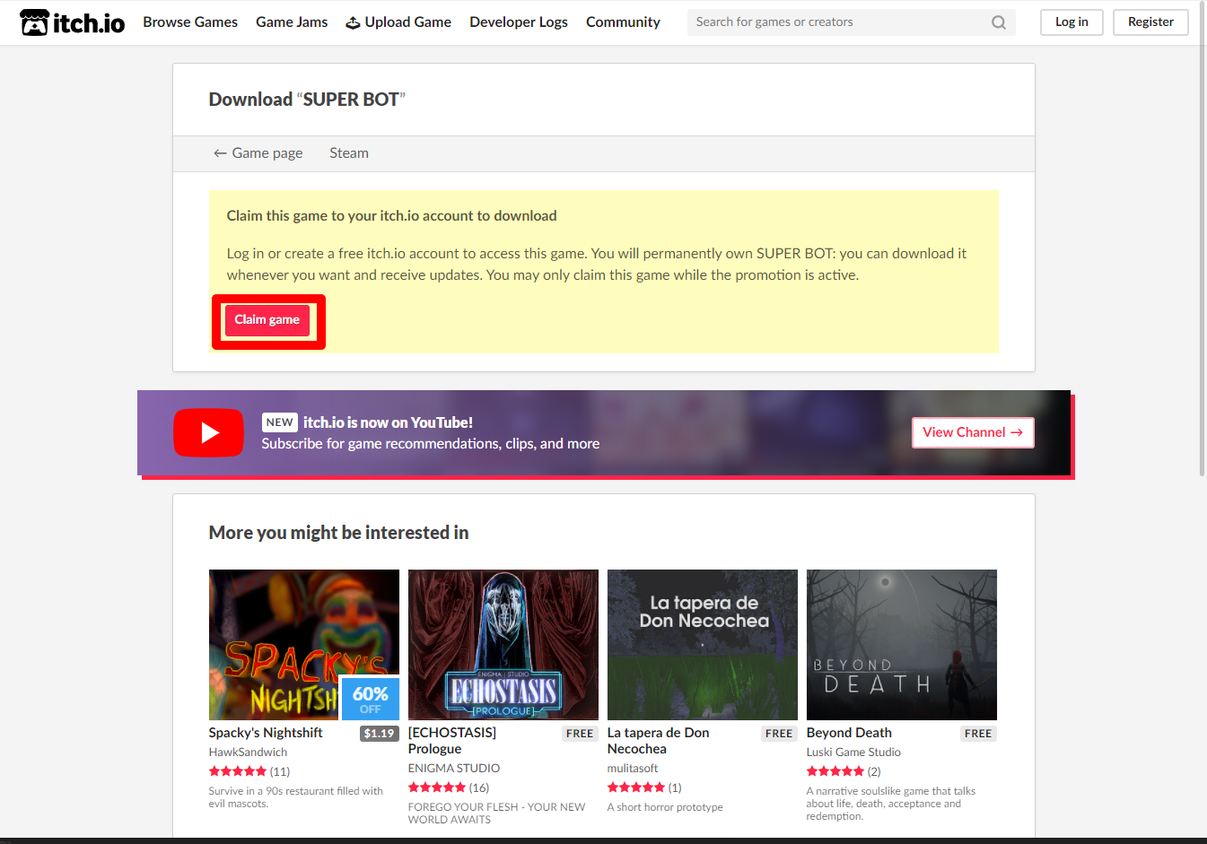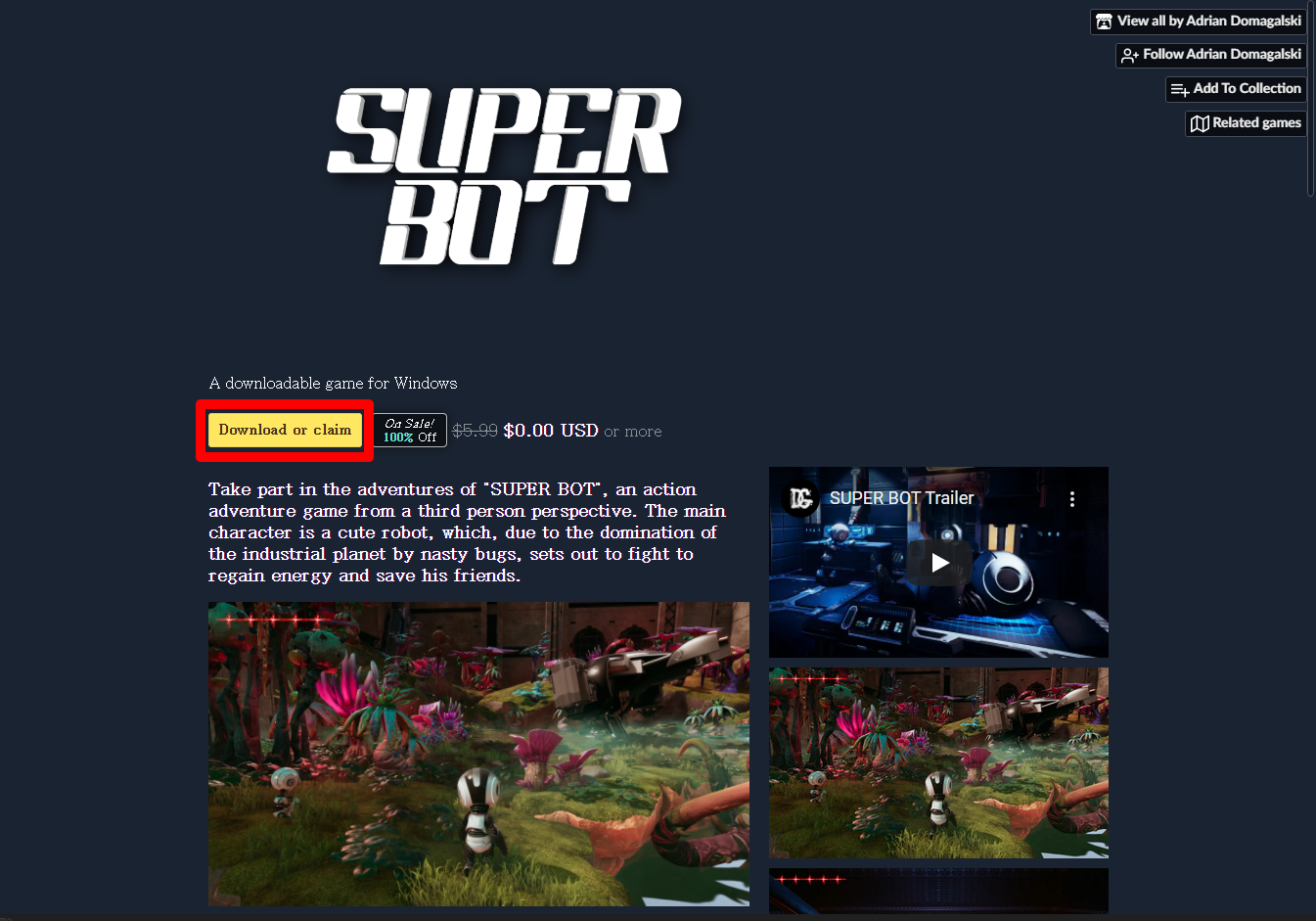 ₩5,500 -> ₩0(Free) SUPER BOT 무료로 받기 영구소장 (재등록) - itch.io 잇치 닷 아이오 한시적 무료 소장하기