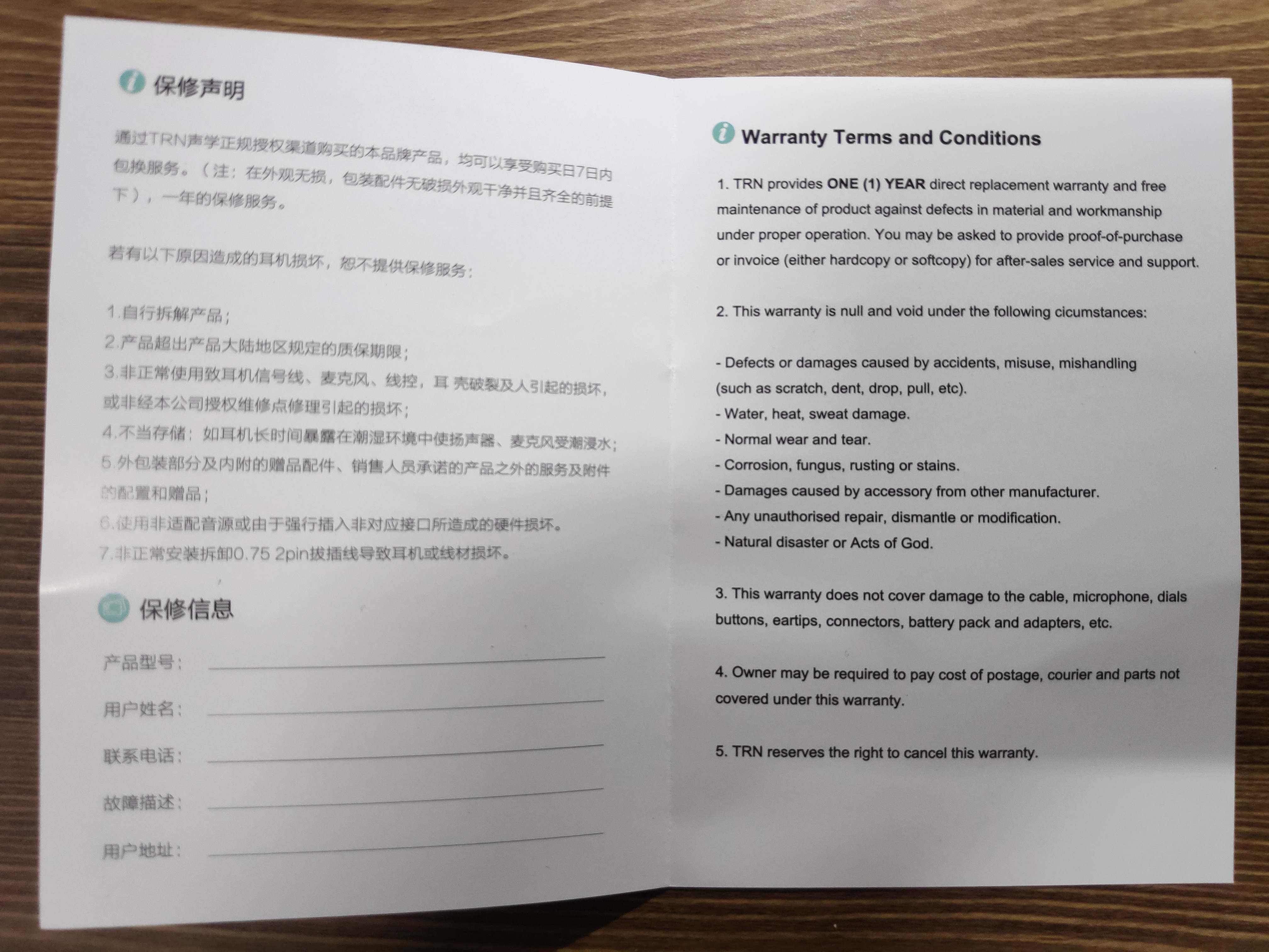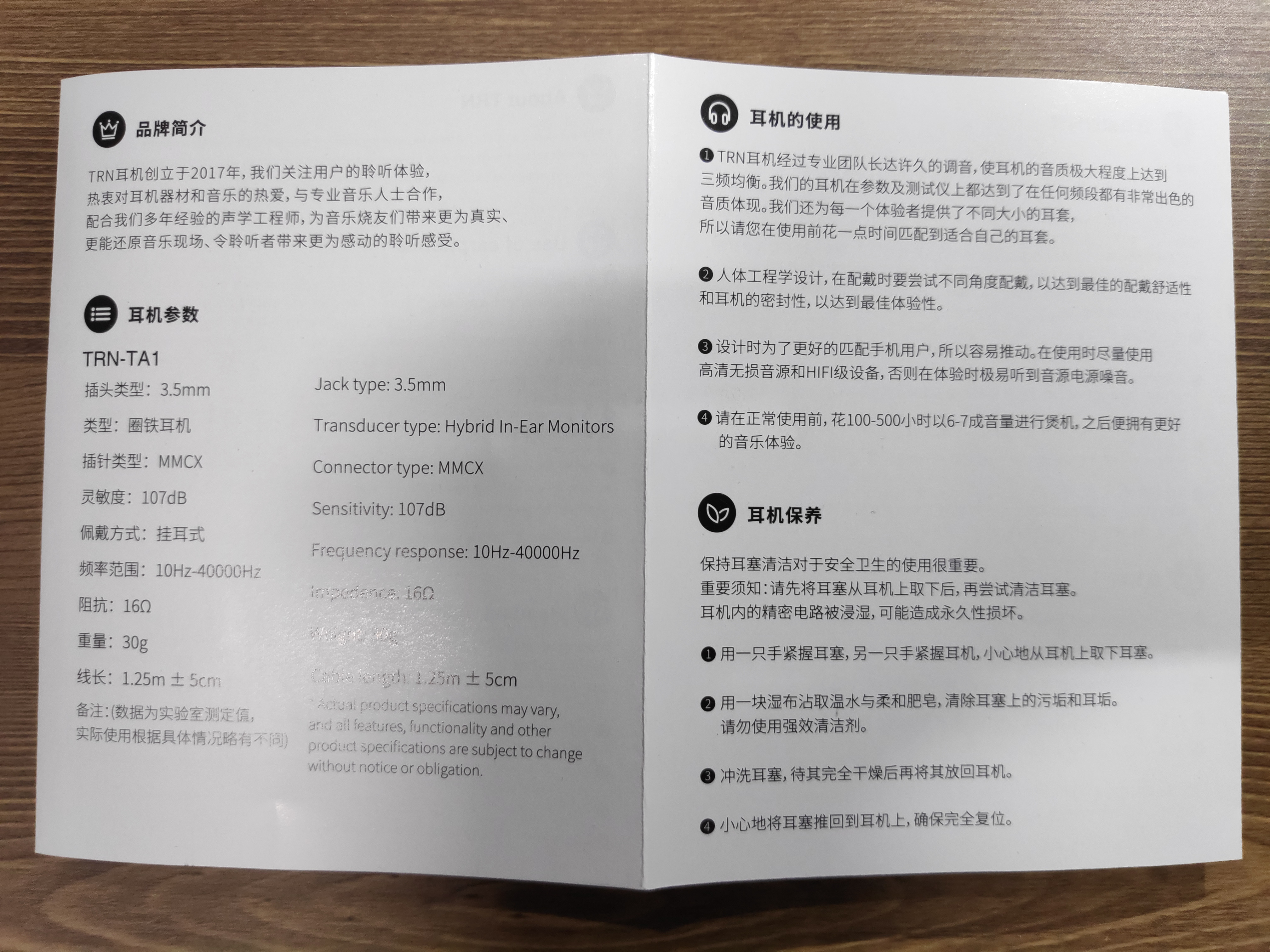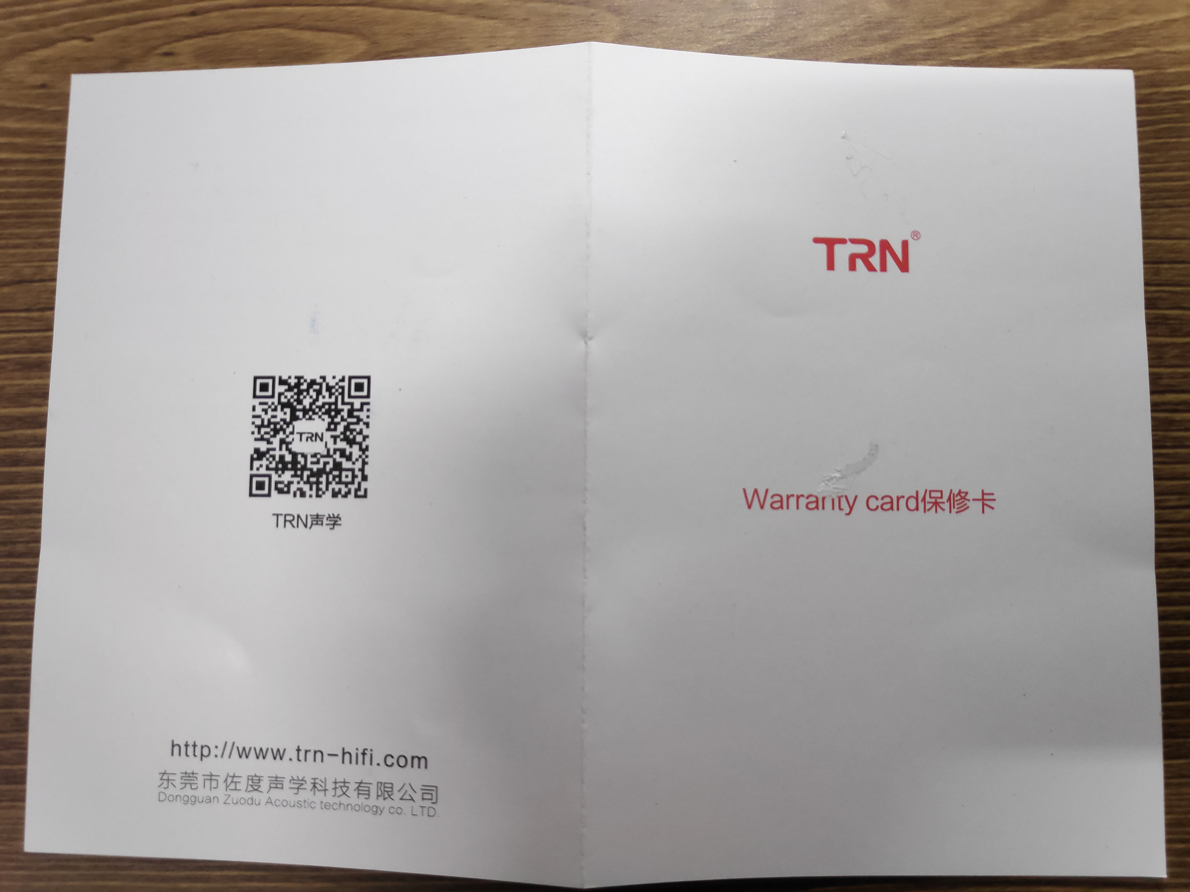 TRN TA1 1DD+1BA 놀스 하이브리드 HIFI 인이어 가성비 유선 이어폰 Manual / 워런티카드 Warranty card