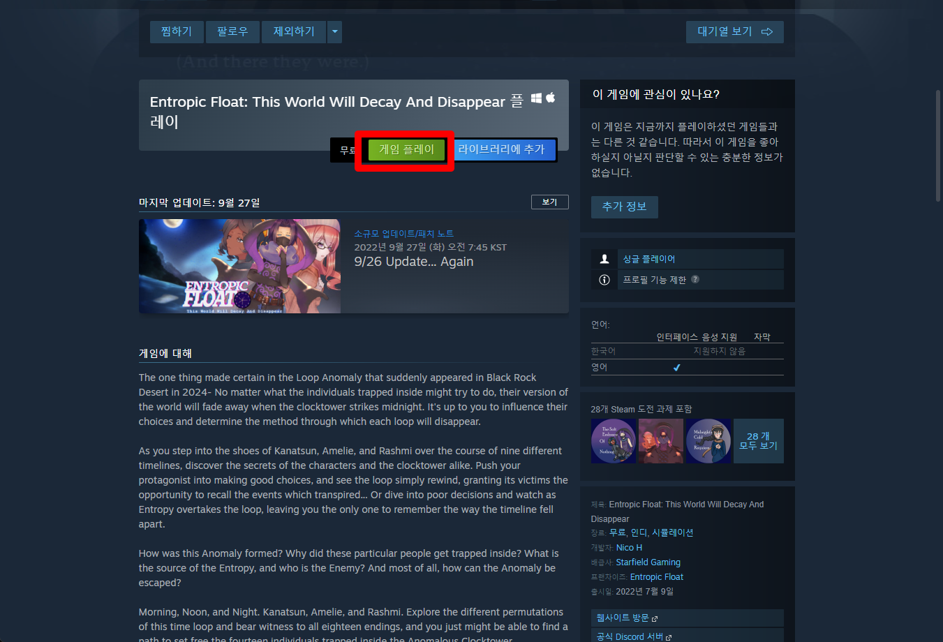 "Entropic Float This World Will Decay And Disappear" 페이지를 내려 [게임 플레이]를 클릭하면 됩니다.