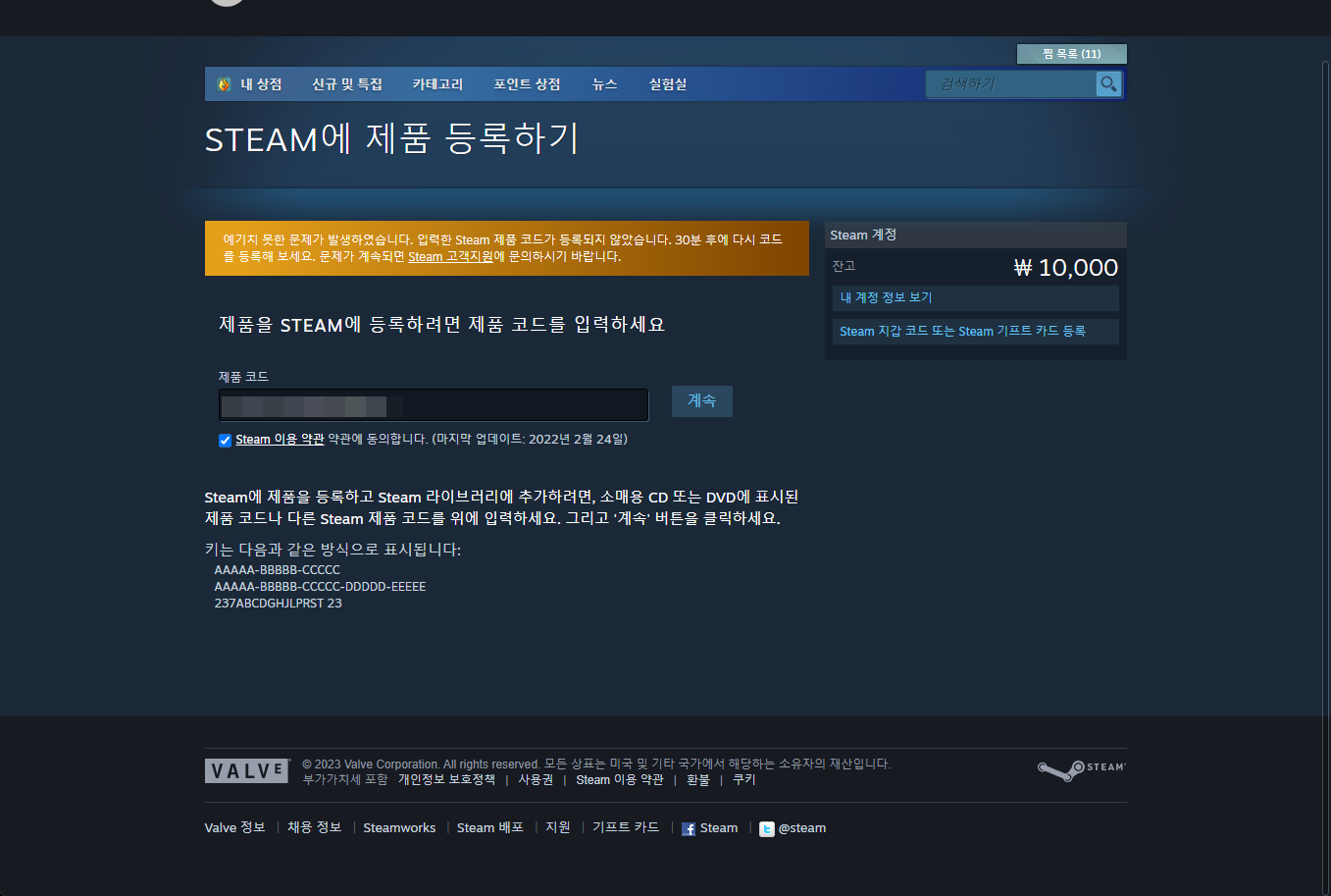 - 예기치 못한 문제가 발생하였습니다. 입력한 Steam 제품 코드가 등록되지 않았습니다. 30분 후에 다시 코드를 등록해 보세요. 문제가 계속되면 Steam 고객지원에 문의하시기 바랍니다.