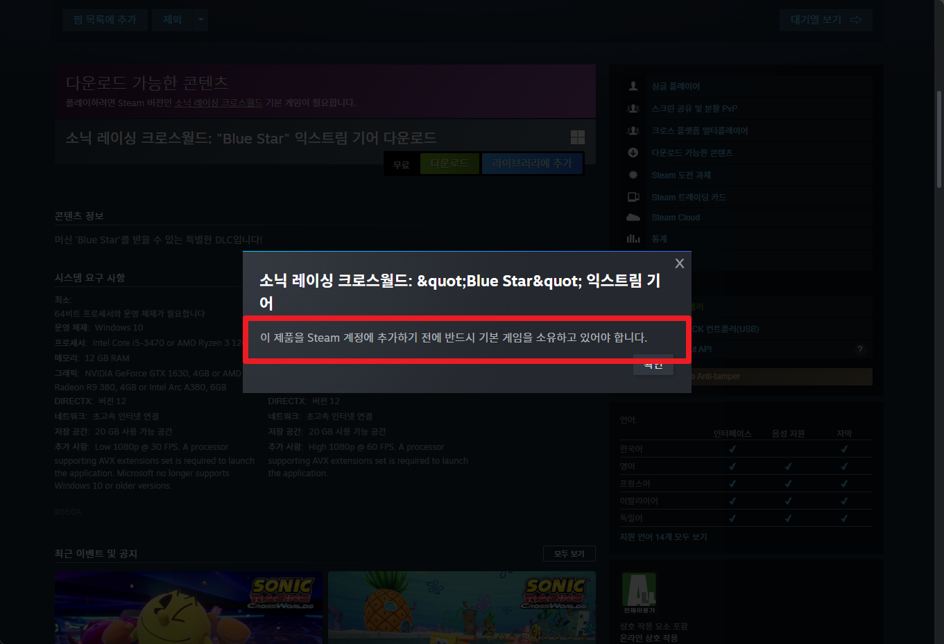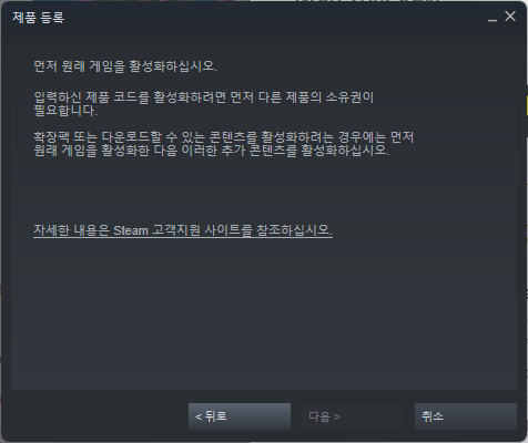 DLC 게임키를 등록할 때는 해당 게임의 base게임을 가지고 있어야 합니다.