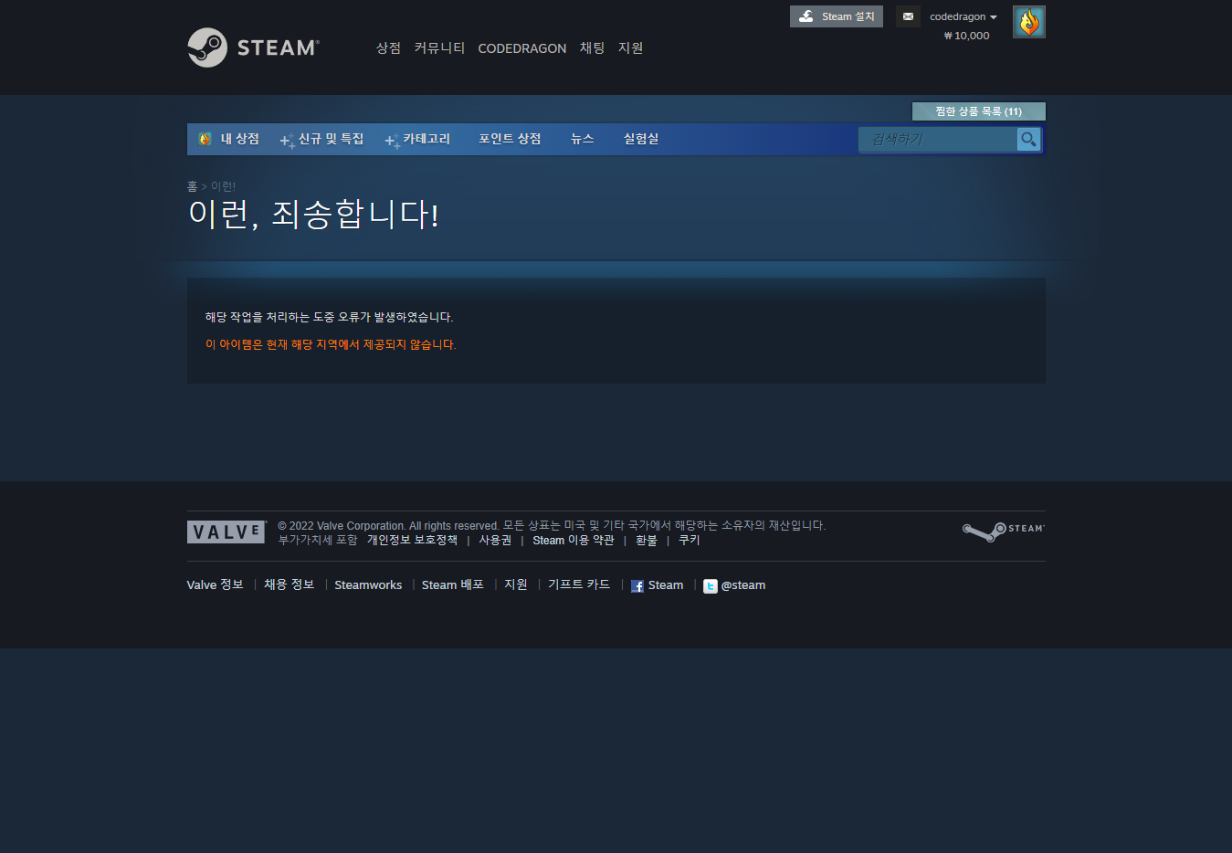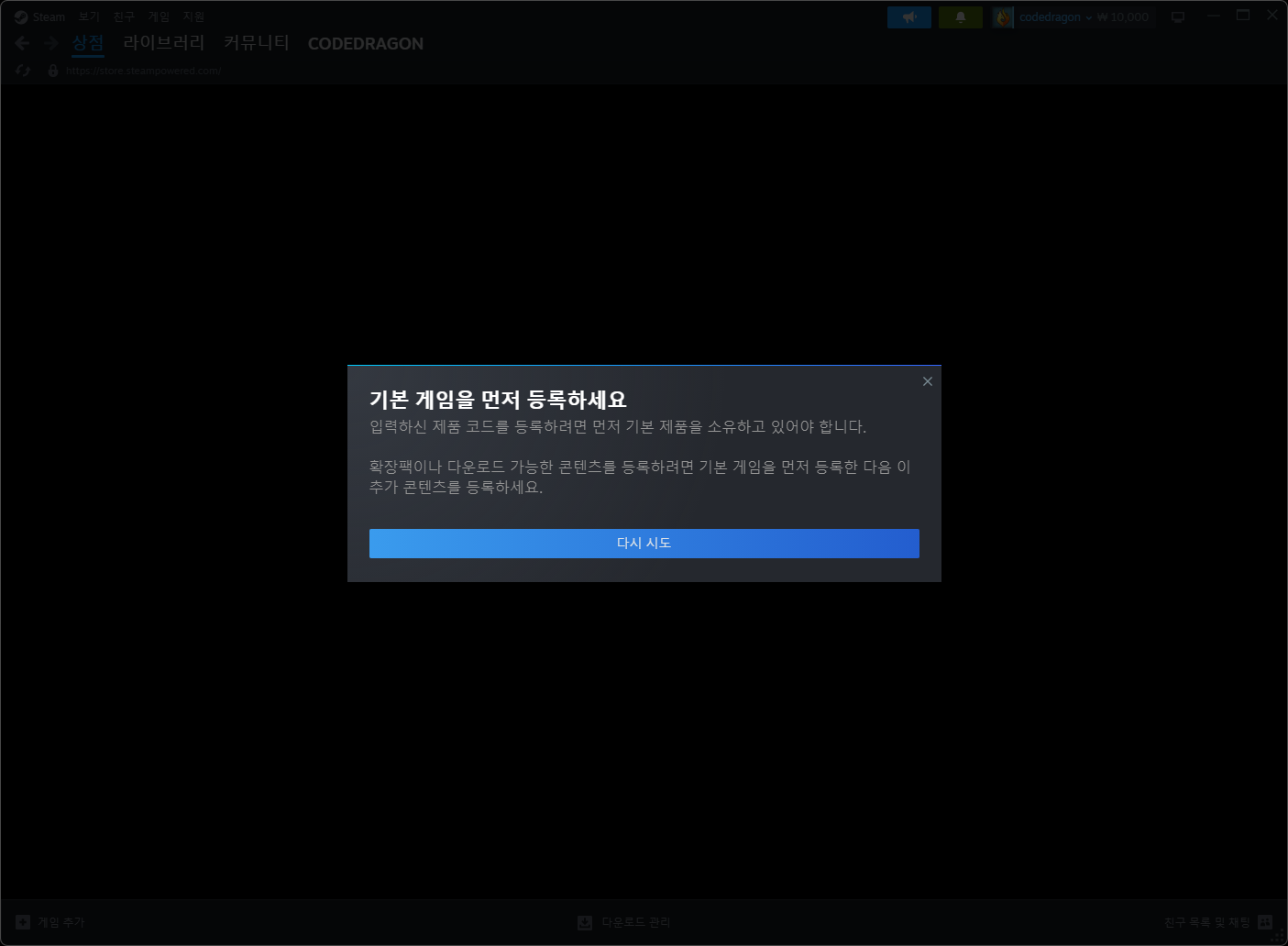 - 이 제품을 귀하의 Steam 계정에 추가하는 중 문제가 발생했습니다.