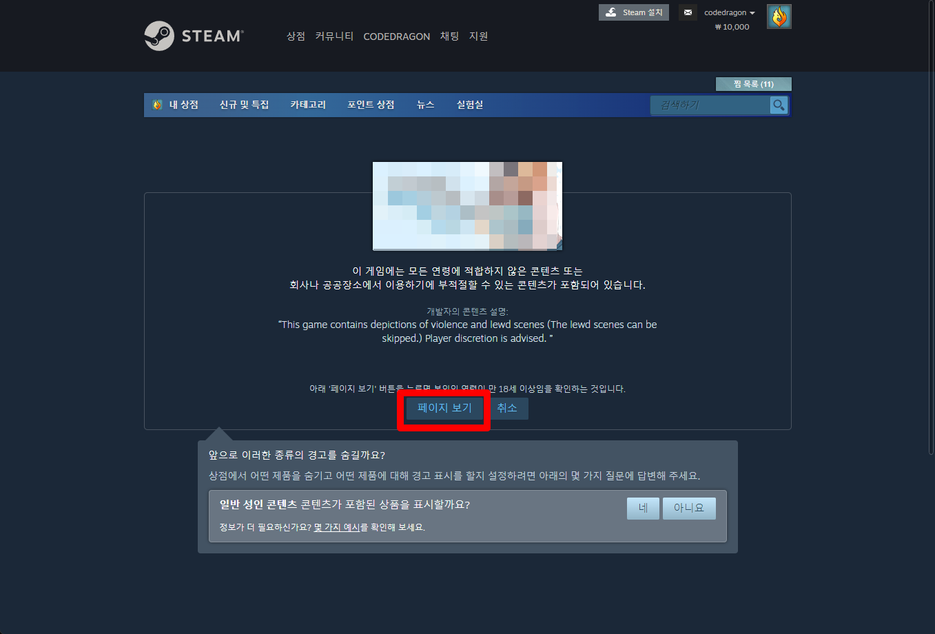 로그인하면 아래에서 보는 것과 같은 콘텐츠 적절성에 대한 안내 내용과 연령확인을 위한 동의 페이지가 나타납니다.