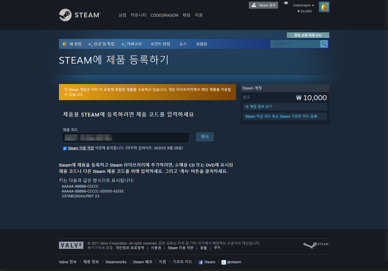 일시적인 문제일 수 있습니다. 스팀 제품키 확인 후 [계속] 버튼 클릭하면 정상적으로 등록됩니다.