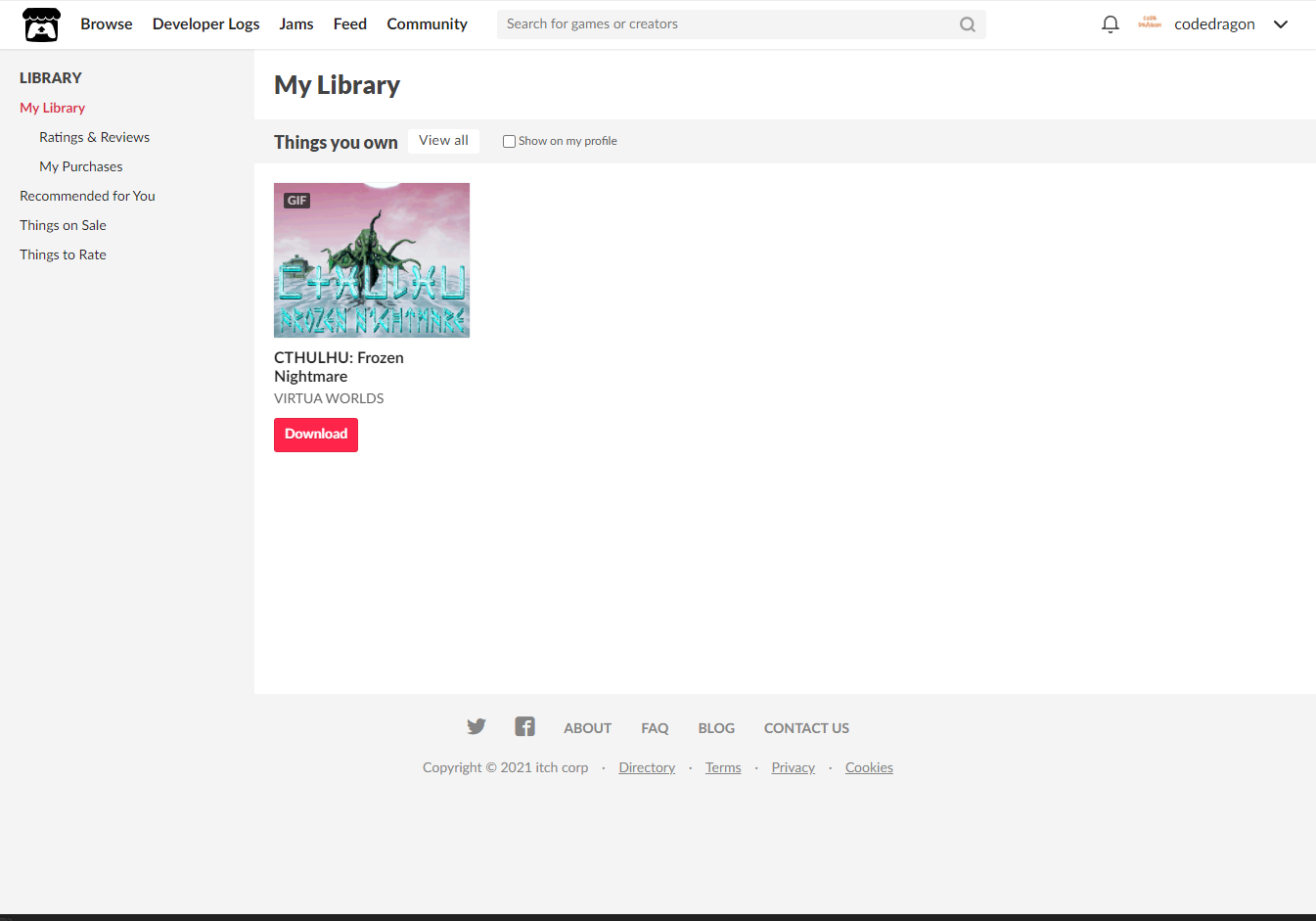 "My Lirary"에서 방금 받은 "CTHULHU: Frozen Nightmare" 게임 항목을 확인할 수 있습니다.