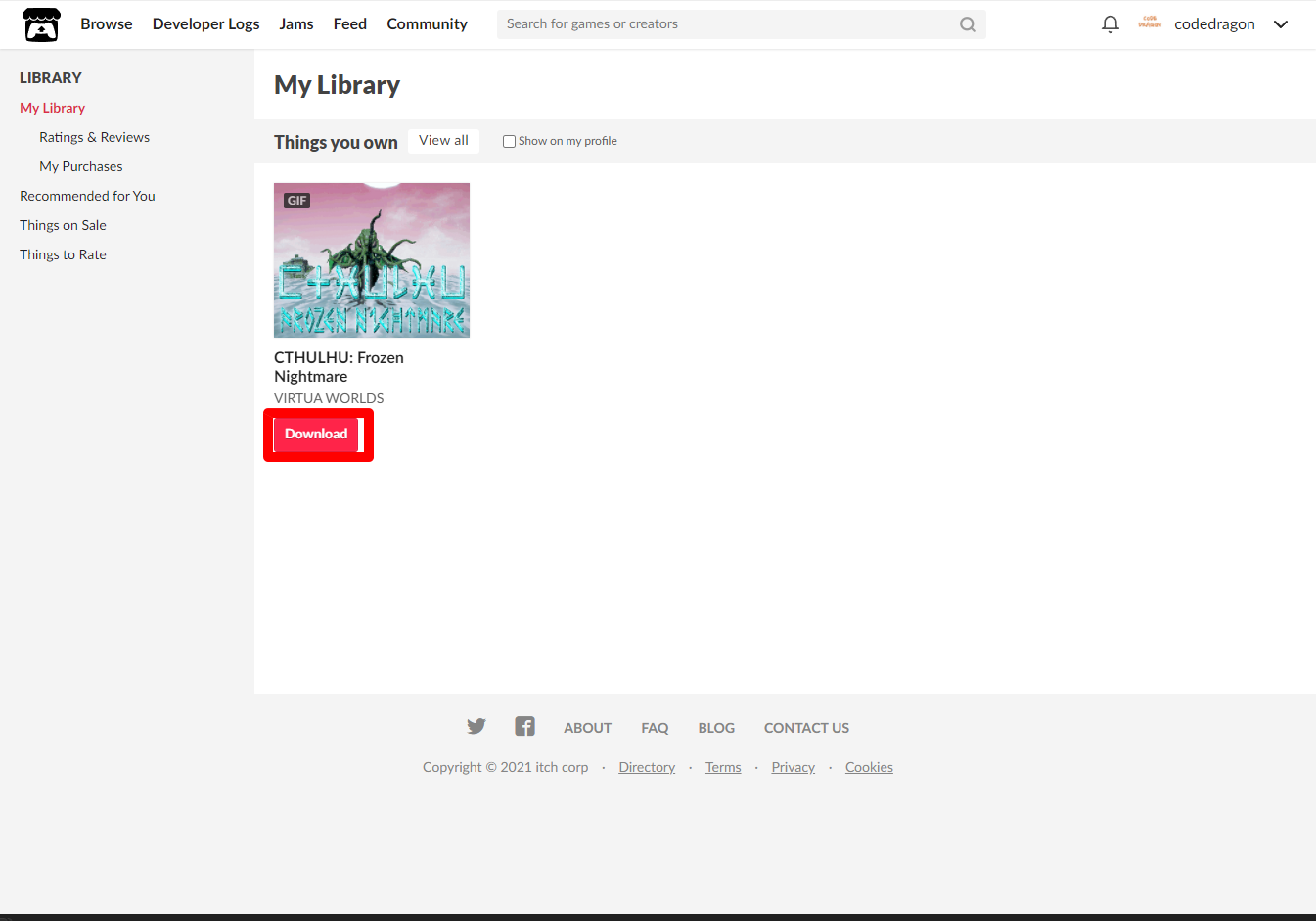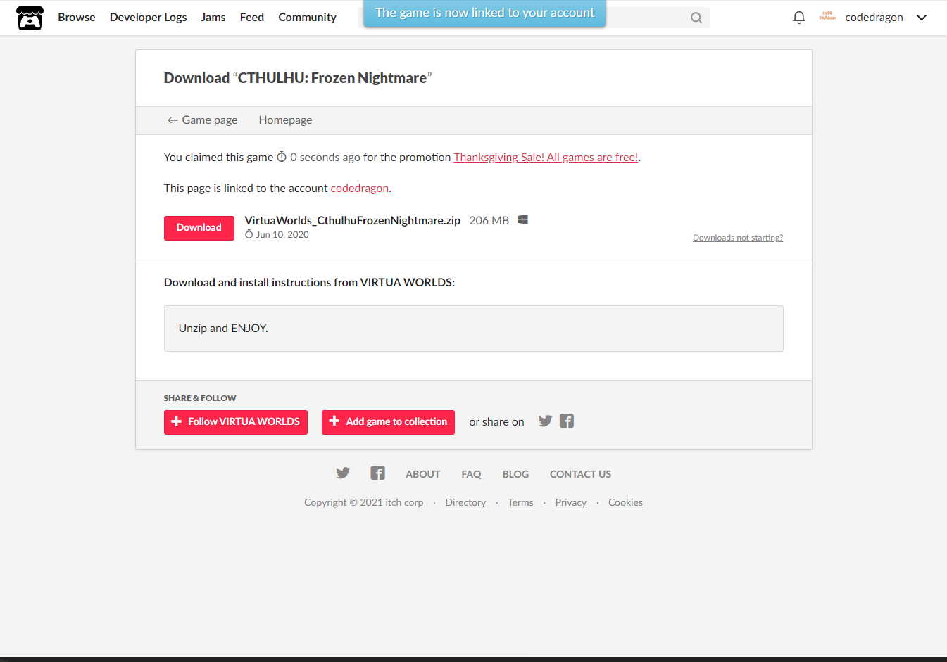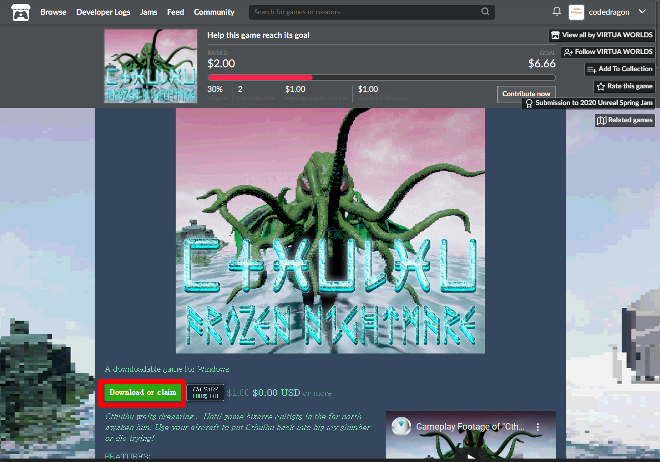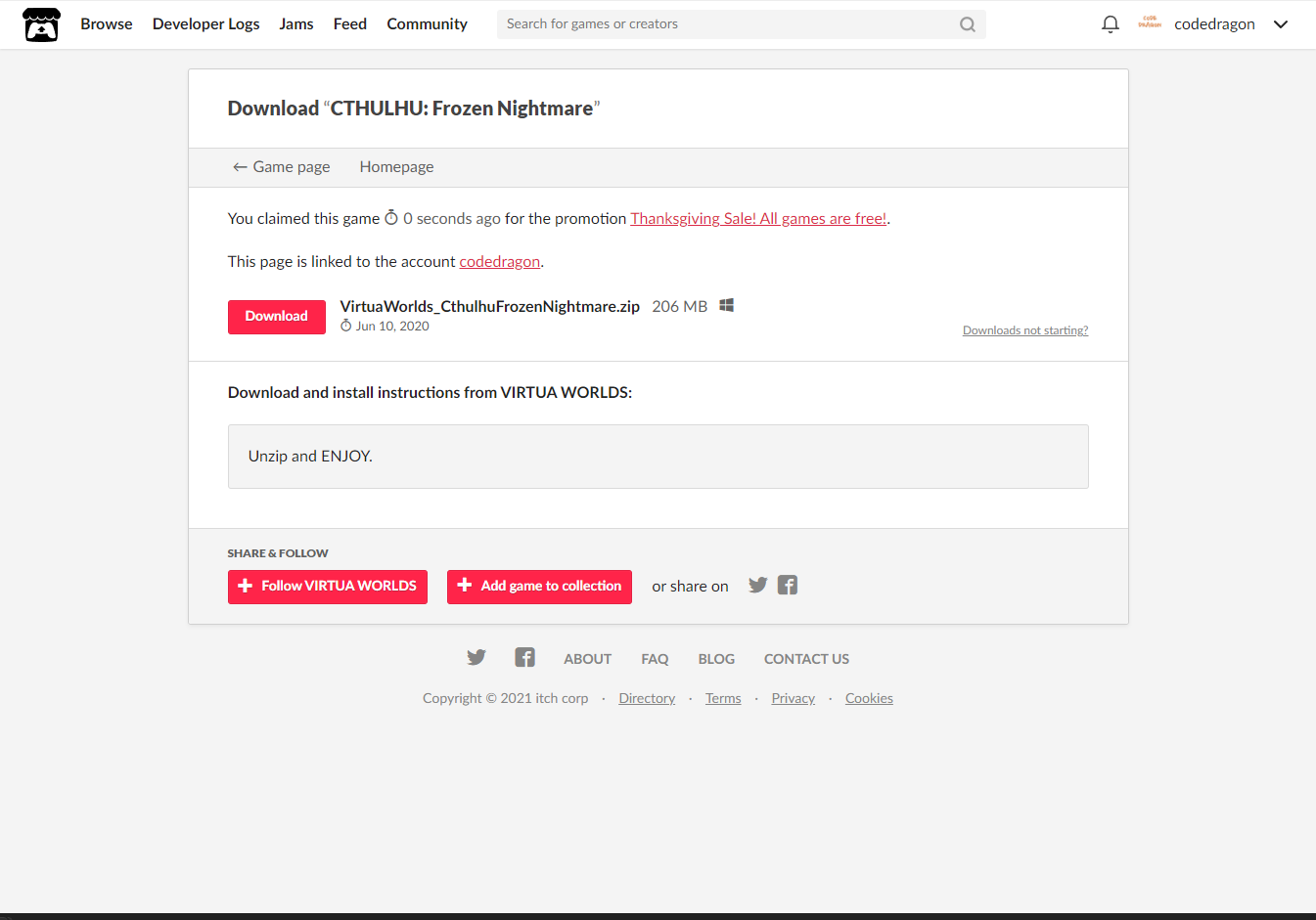 "CTHULHU: Frozen Nightmare" 해당 항목에 있는 [Download] 버튼을 클릭하면 게임의 설치파일을 다운받을 수 있습니다.