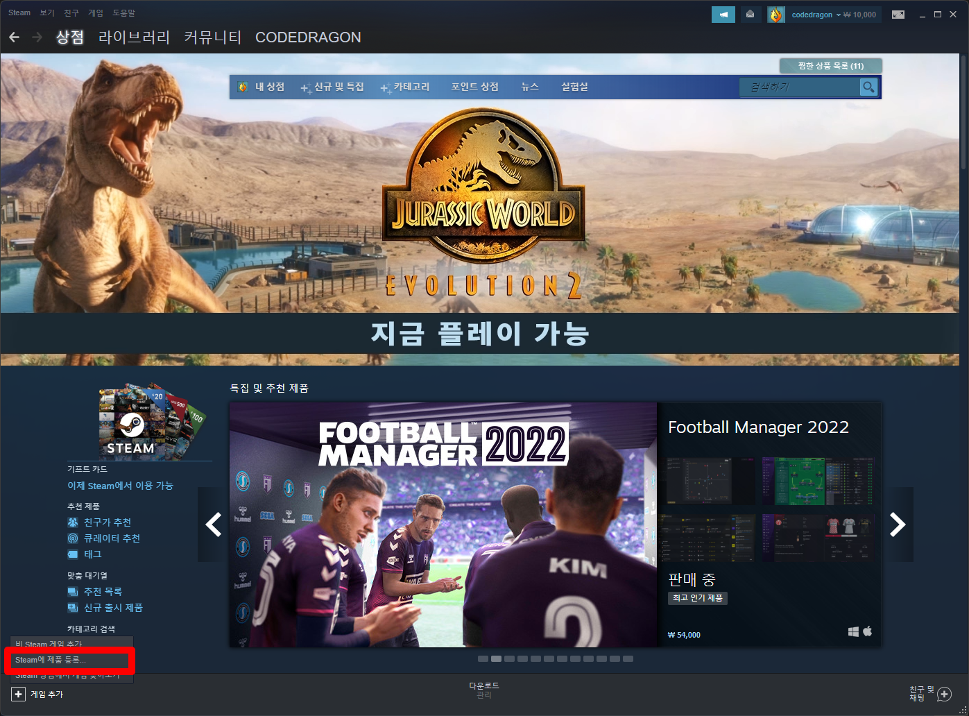나오는 메뉴에서 [Steam에 제품 등록]을 클릭합니다.