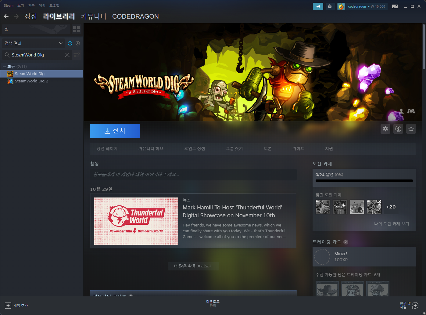 나의 게임 라이브러리에서 등록한 "SteamWorld Dig" 항목을 확인할 수 있습니다