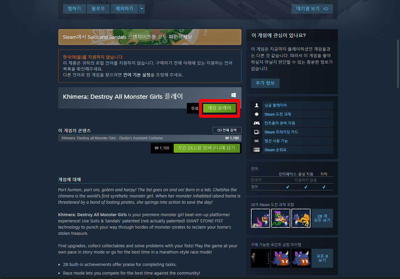 "Khimera Destroy All Monster Girls" 페이지를 내려 [게임 플레이]를 클릭하면 됩니다.