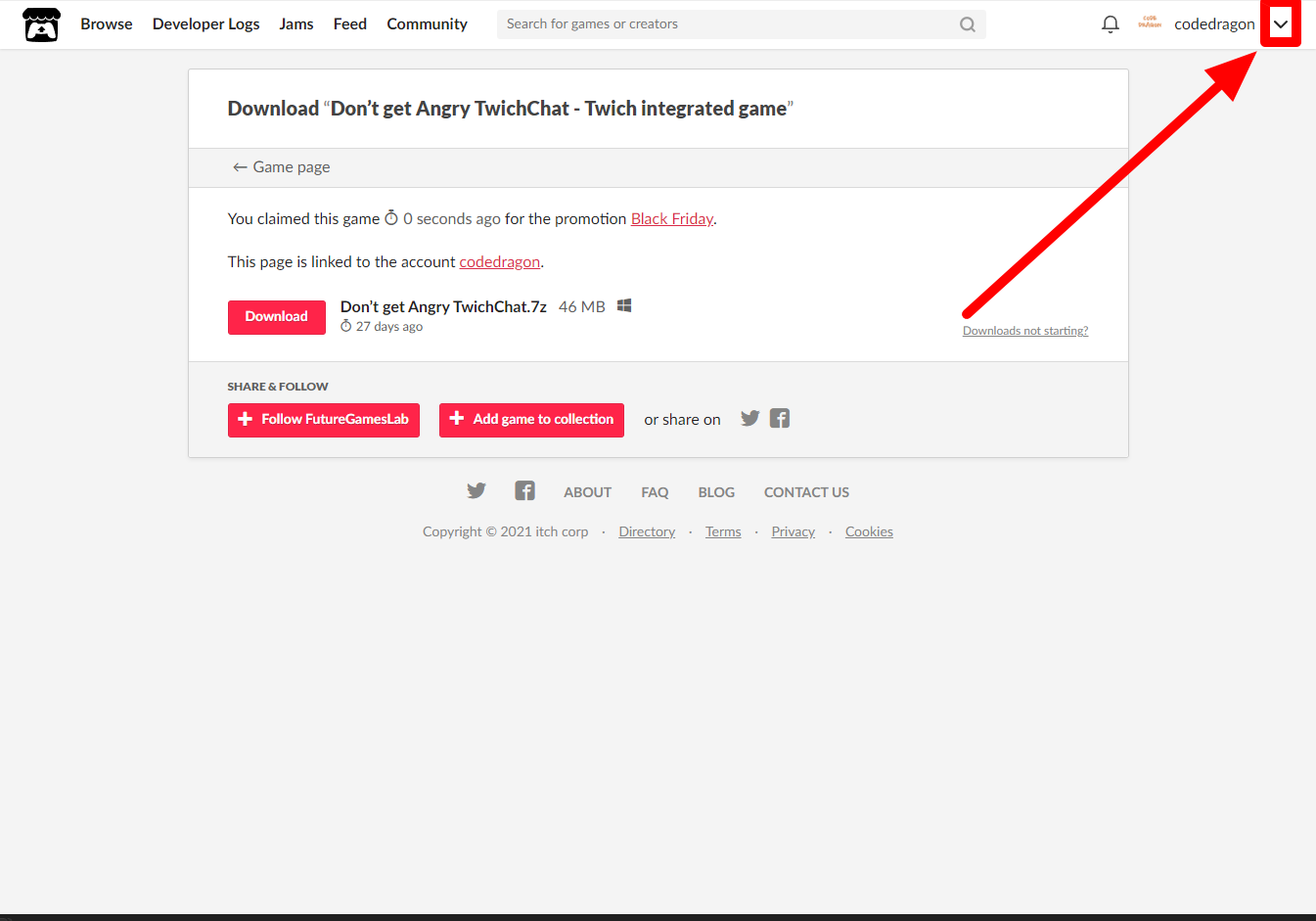 itch.io에서 받은 게임 확인해 설치파일 다운받아 보겠습니다. 우측 상단의 나의 사용자명 오른쪽의 화살표 아이콘을 클릭합니다.