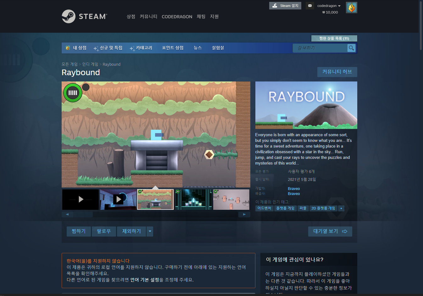 "Raybound" 페이지를 내려 [게임 플레이]를 클릭하면 됩니다.