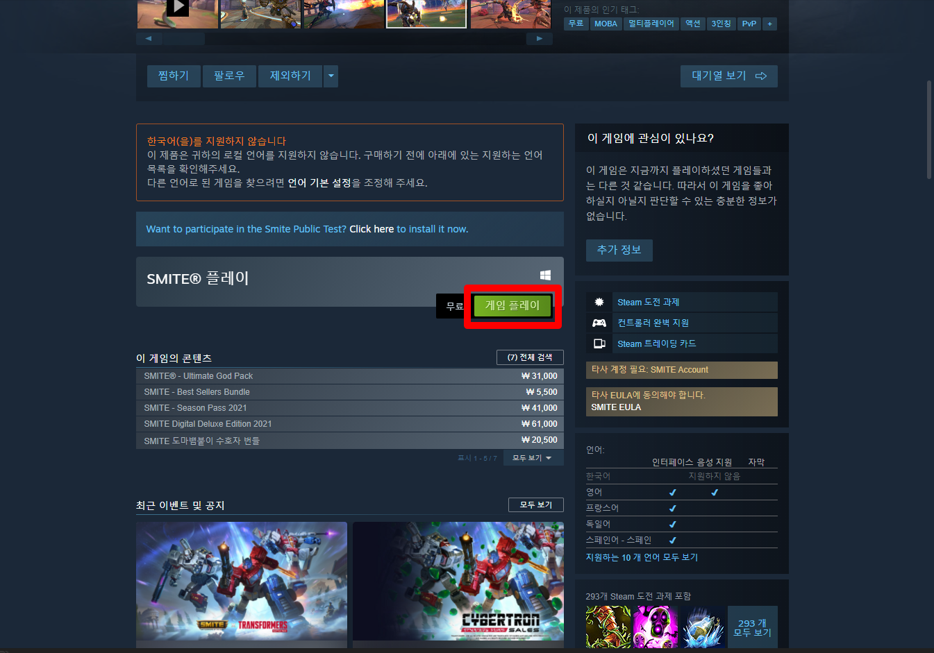 "SMITE" 페이지를 내려 [게임 플레이]를 클릭하면 됩니다.