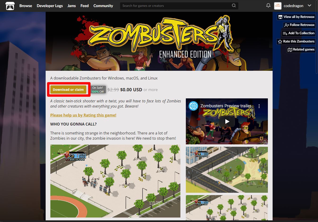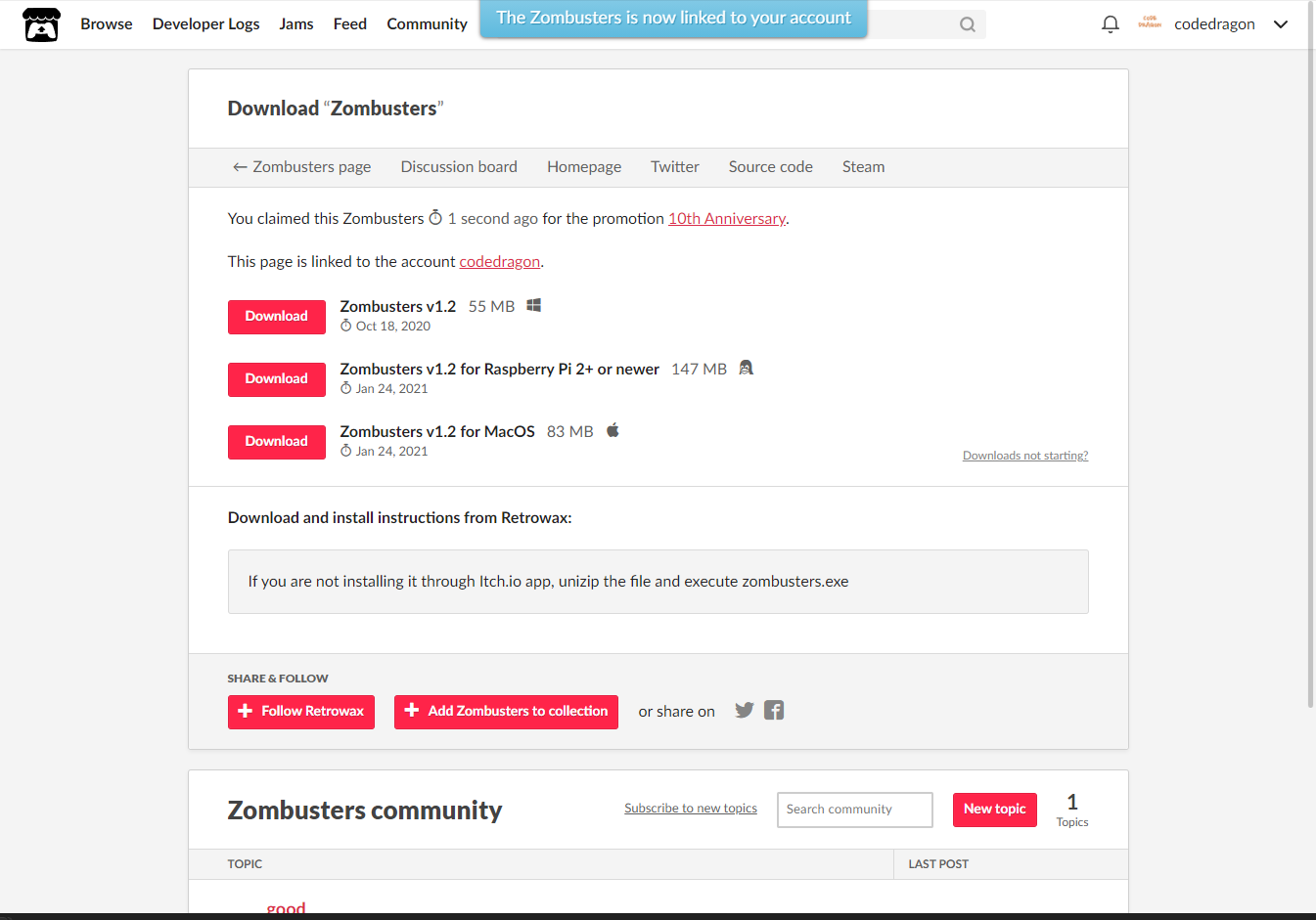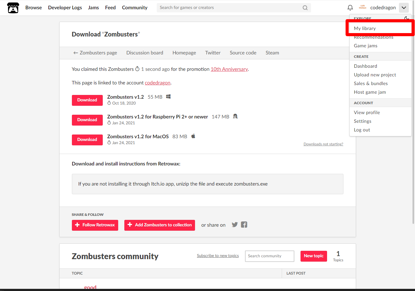 [Claim Zombusters]을 클릭하면 나의 게임 라이브러리에 추가되고 설치파일을 다운받을 수 있는 페이지로 이동됩니다.